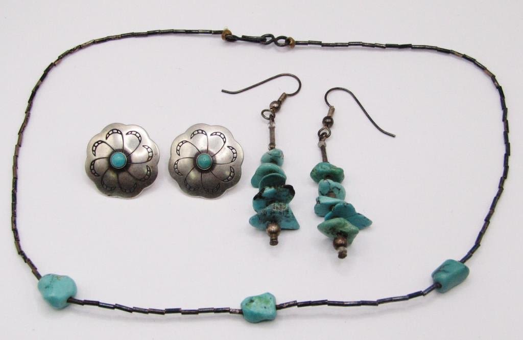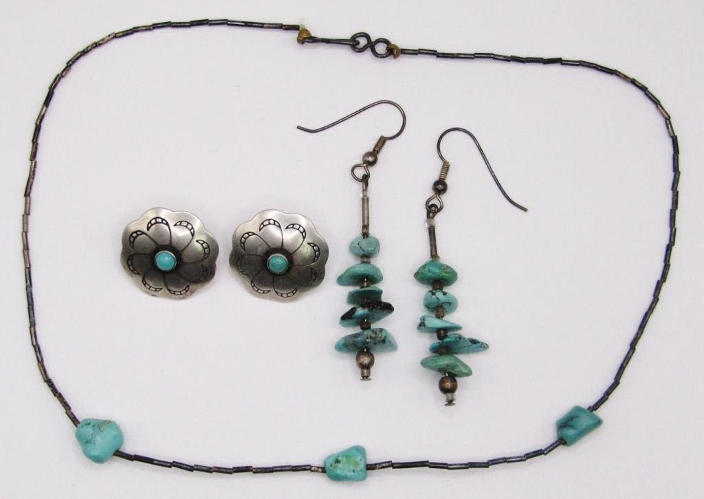 STERLING NECKLACE & (2)PAIRS OF EARRINGS WITH TURQUOISE STONE ACCENTS-NICE LOT!!! TOTAL 8 DWT