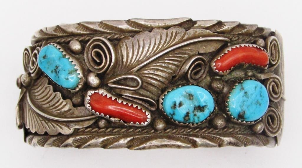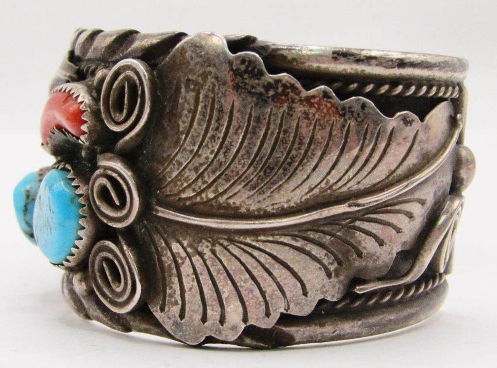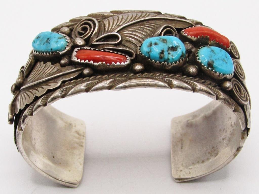 RED CORAL AND TURQUOISE STONES-LEAF DESIGN-CHUNKY PIECE! TOTAL 41 DWT