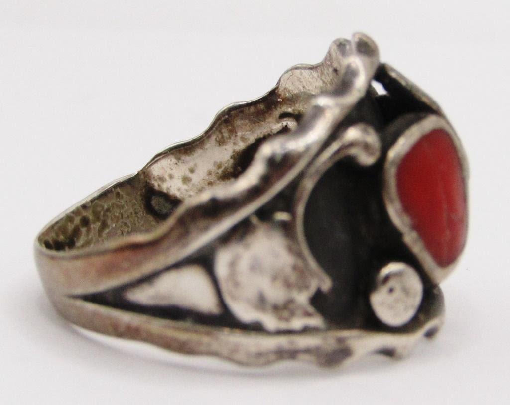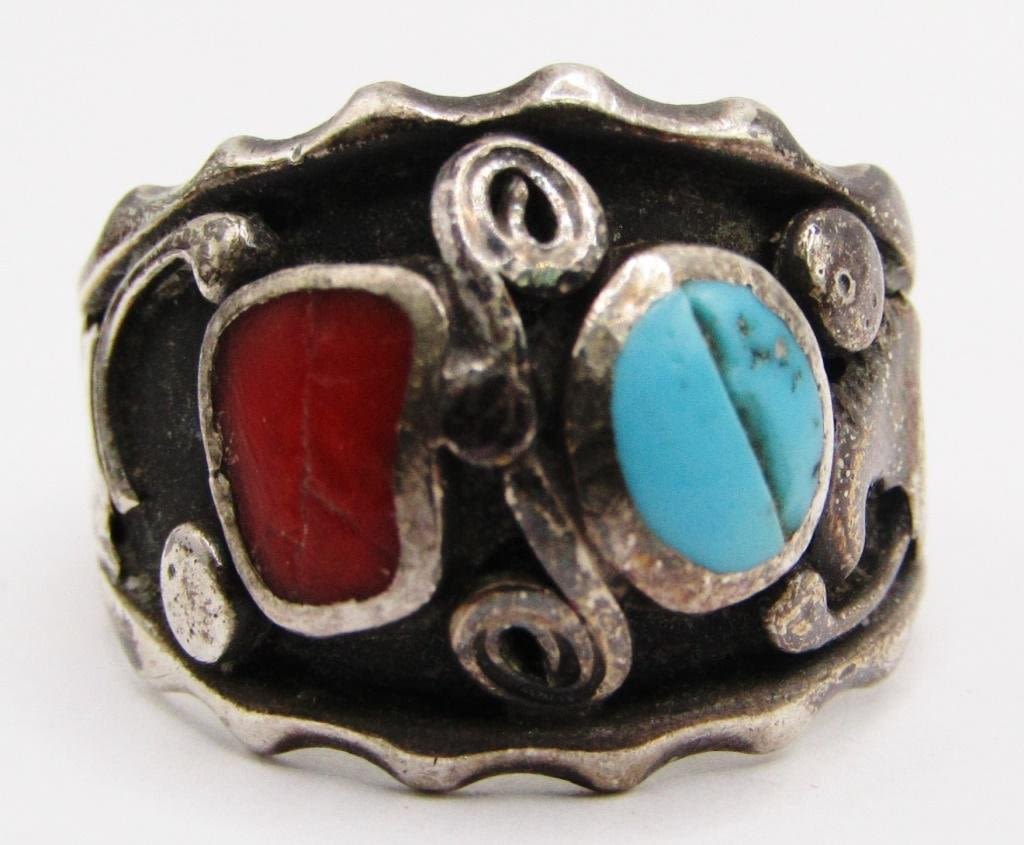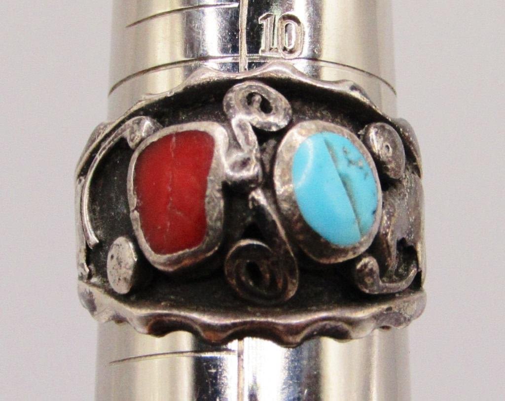 RED CORAL AND TURQUOISE INLAY-RING SIZE 10.5-TOTAL 4 DWT