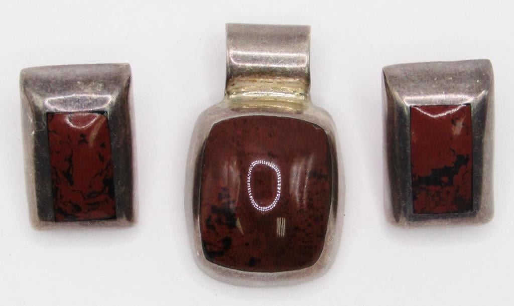 MAROON AND BLACK INLAY STONE-WITH MATCHING PAIR OF PIERCED EARRINGS-TOTAL 19 DWT