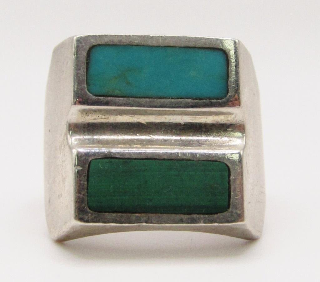 TURQUOISE AND MALACHITE INLAY DESIGN-RING SIZE 10-TOTAL 9.2 DWT