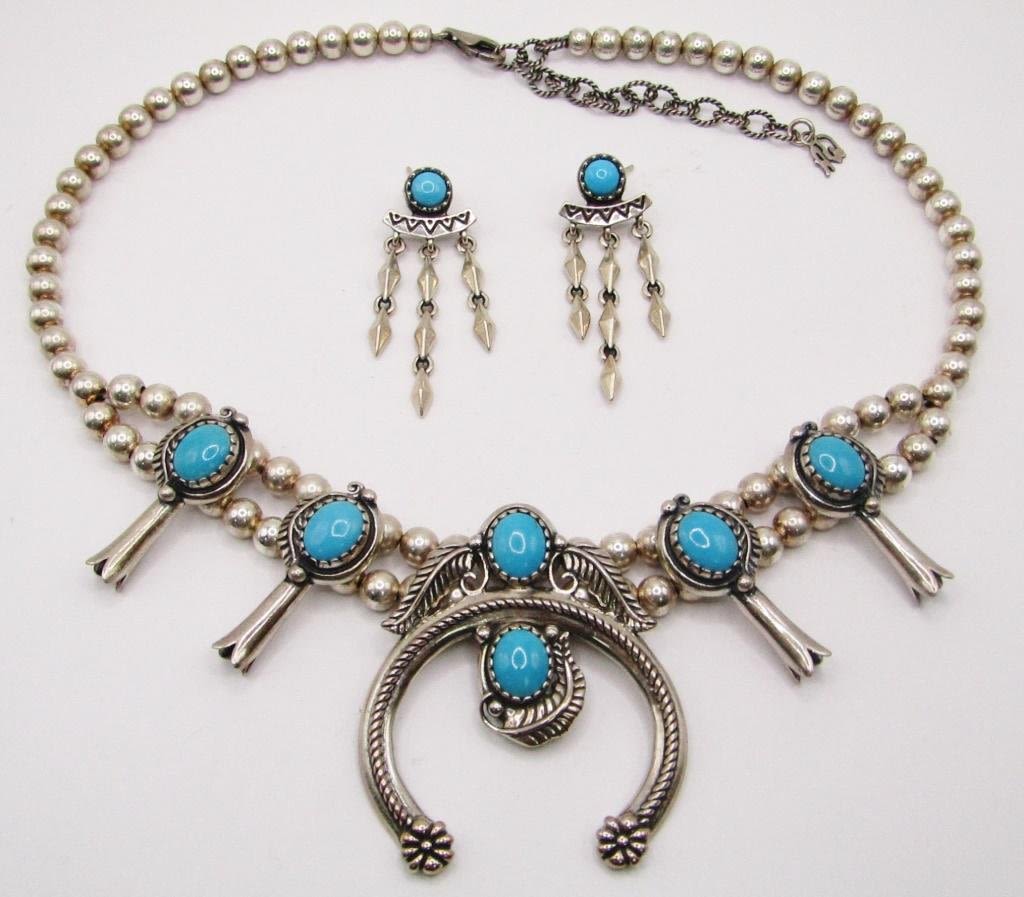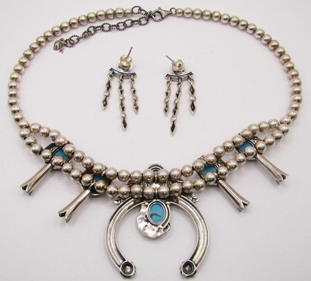 NECKLACE WITH MATCHING PAIR OF PIERCED DANGLY EARRINGS-TURQUOISE ACCENTS-TOTAL 37 DWT