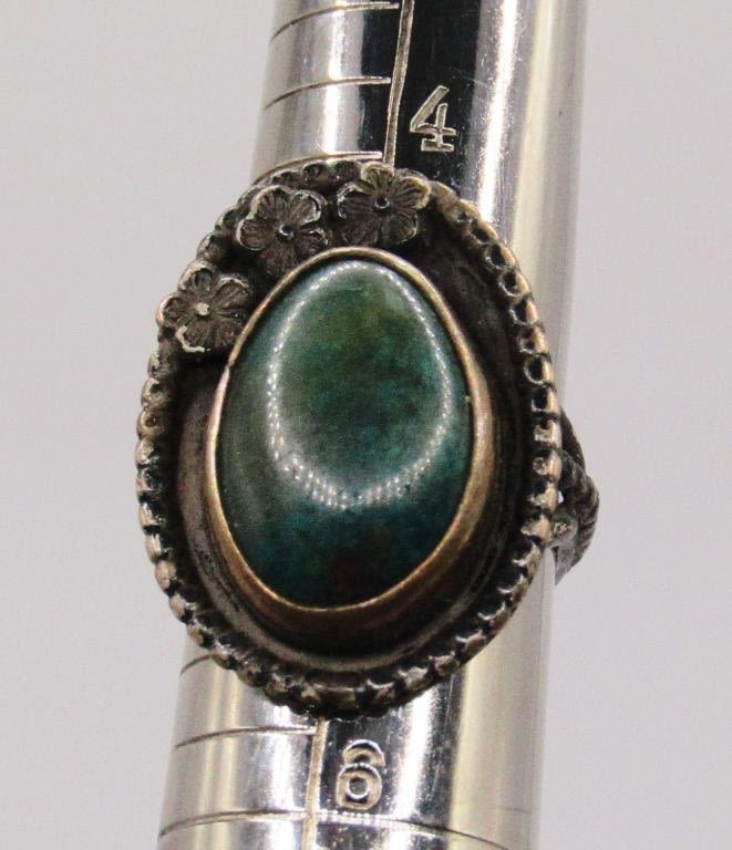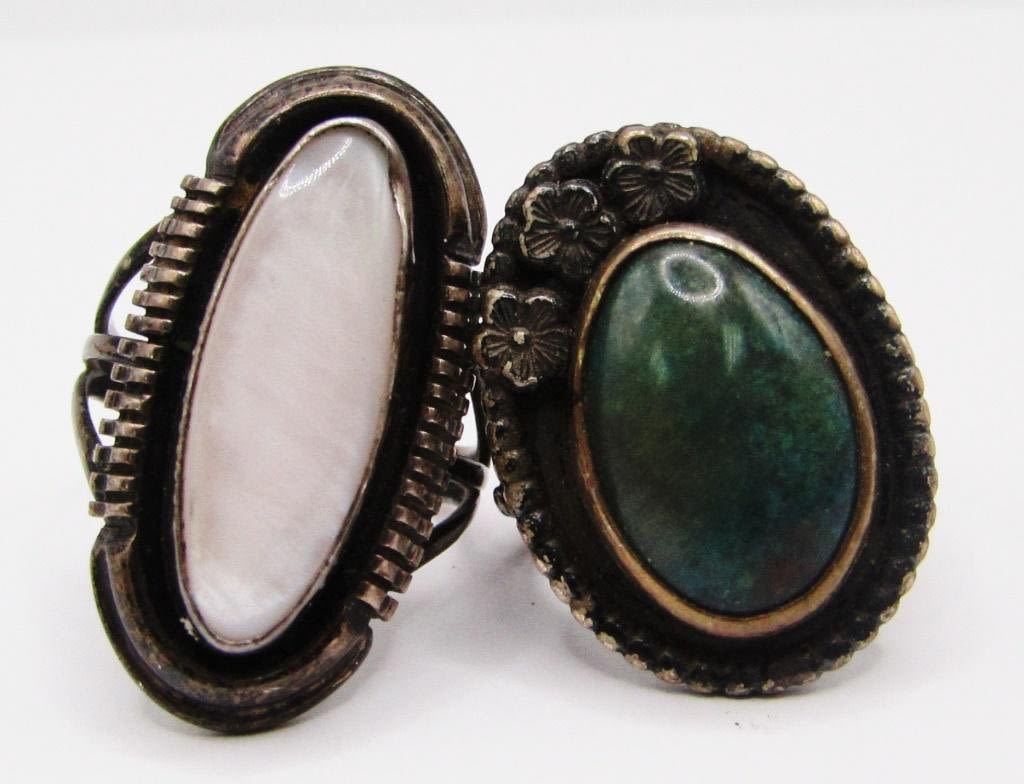 WITH MOTHER OF PEARL CENTER STONE (1)WITH GREEN CENTER STONE WITJ FLORAL DESIGN-RING SIZES 6 & 8-TOTAL 8 DWT
