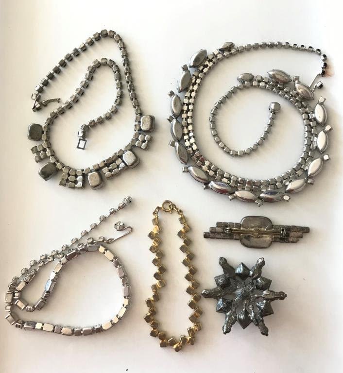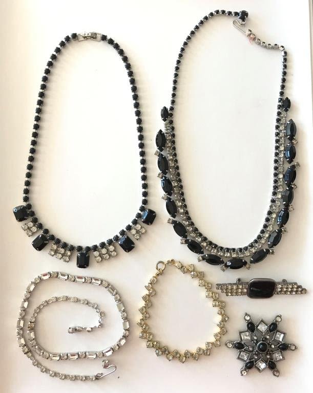 2 BROOCHES, 3 NECKLACES AND ONE BRACELET ****ONE NECKLACE IS MISSING ONE RHINESTONE!)