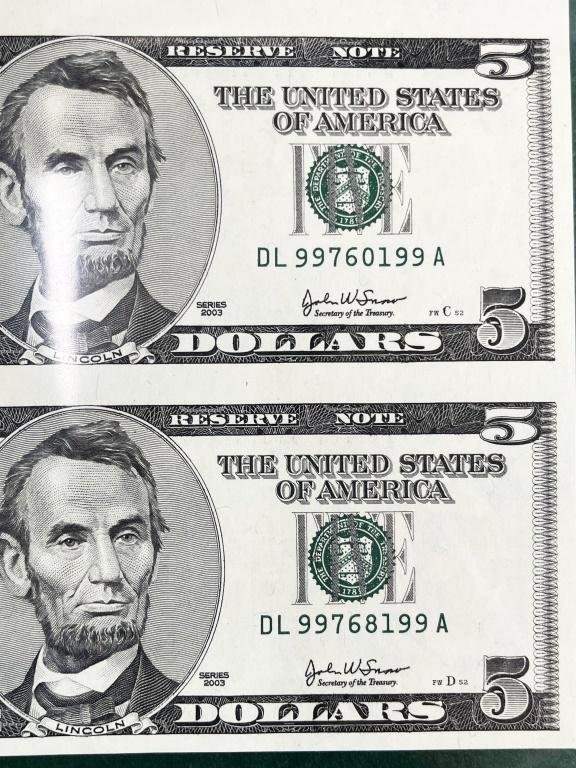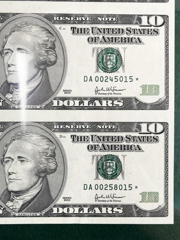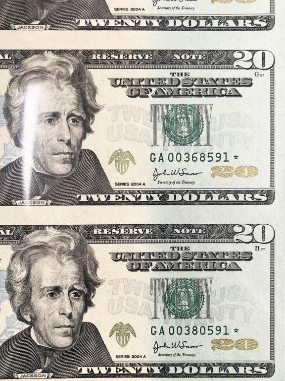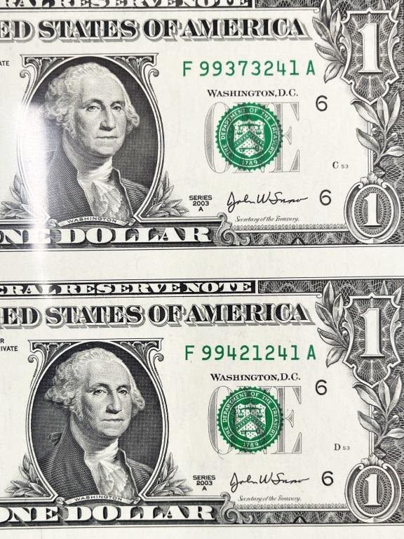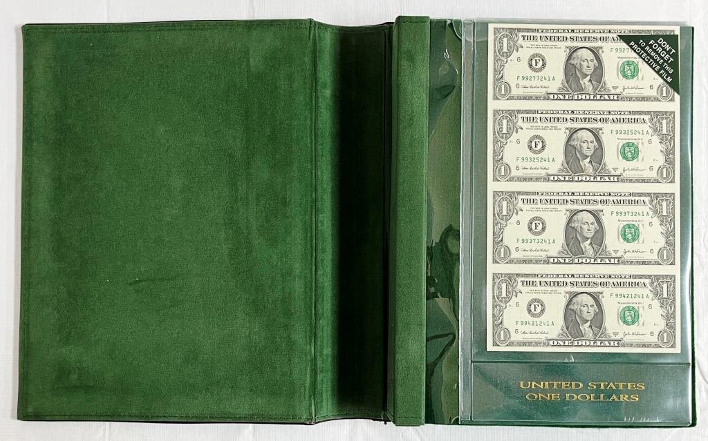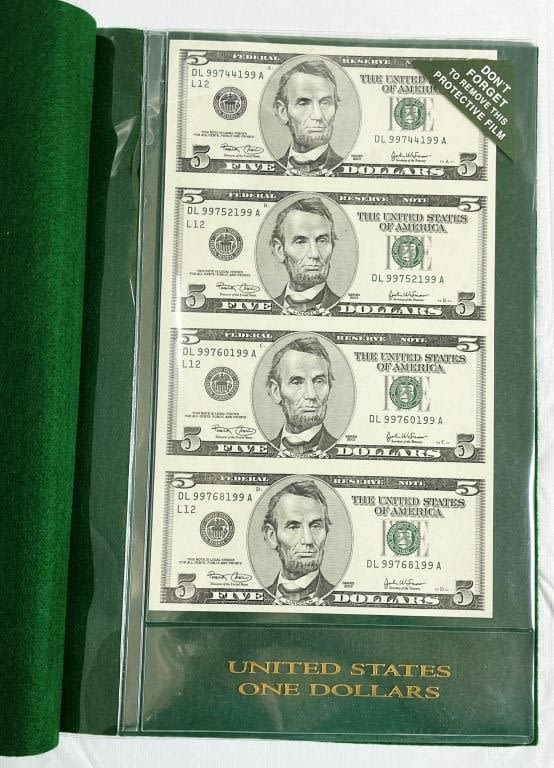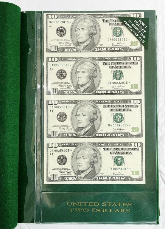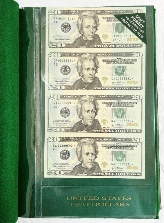 (4) UNCUT SHEETS – 2003 $1 UNCUT of 4; 2003 $5 UNCUT SHEET of 4; 2003 $10 "STAR NOTE" UNCUT SHEET of 4; 2004 $20 "STAR NOTE" UNCUT SHEET of 4 – ALL in LARGE CURRECY ALBUM with EXTRA PAGES to FILL