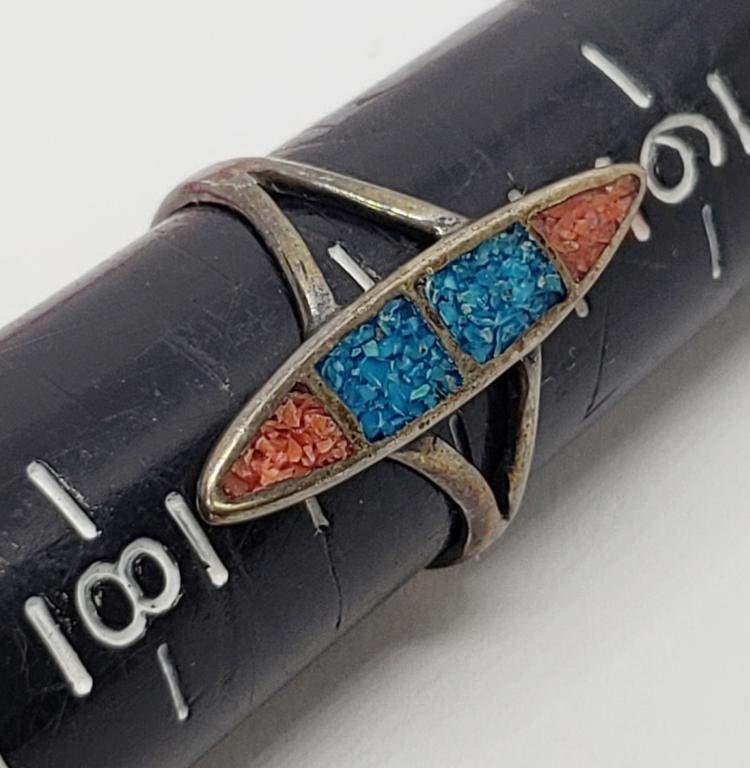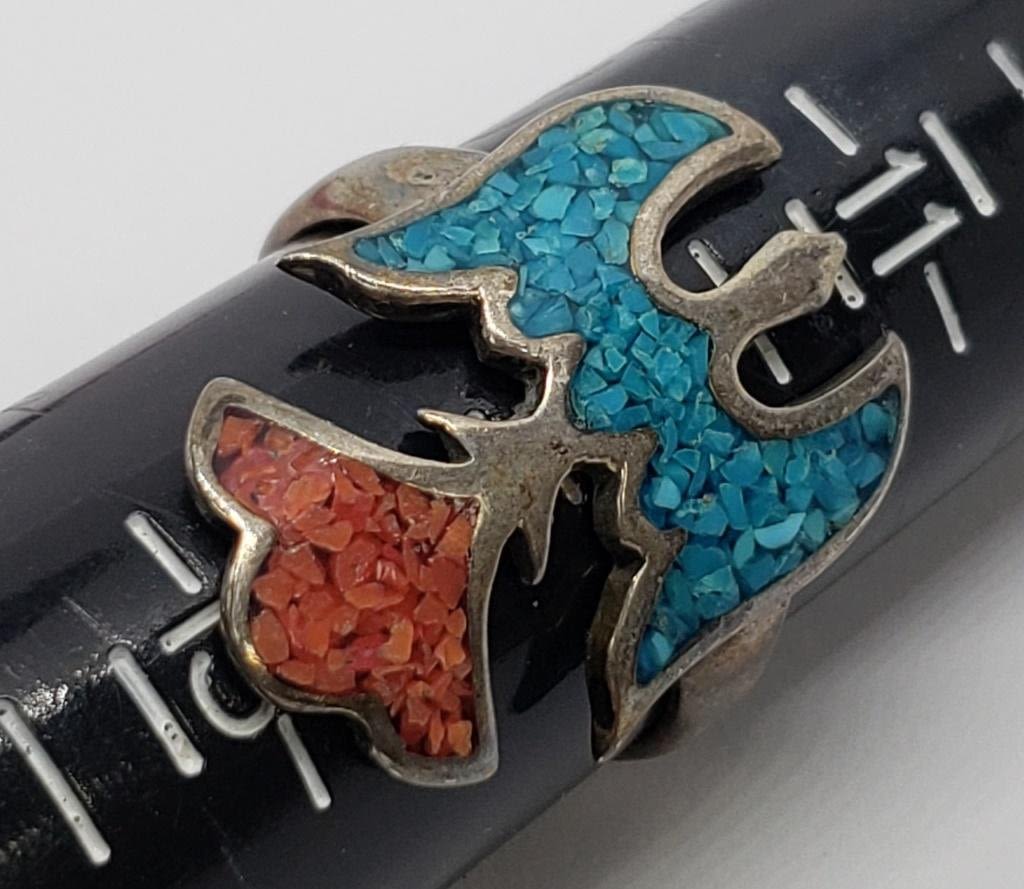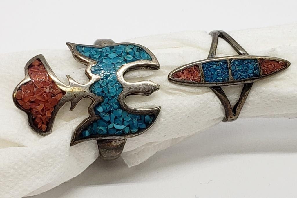 TURQUOISE AND RED CORAL INLAY STONE DESING (1)THUNDERBIRD-RING SIZES 7 & 12-TOTAL 6.1 DWT