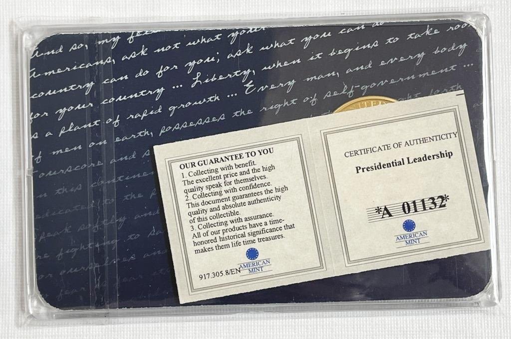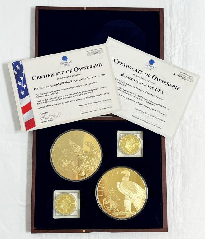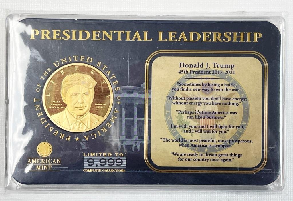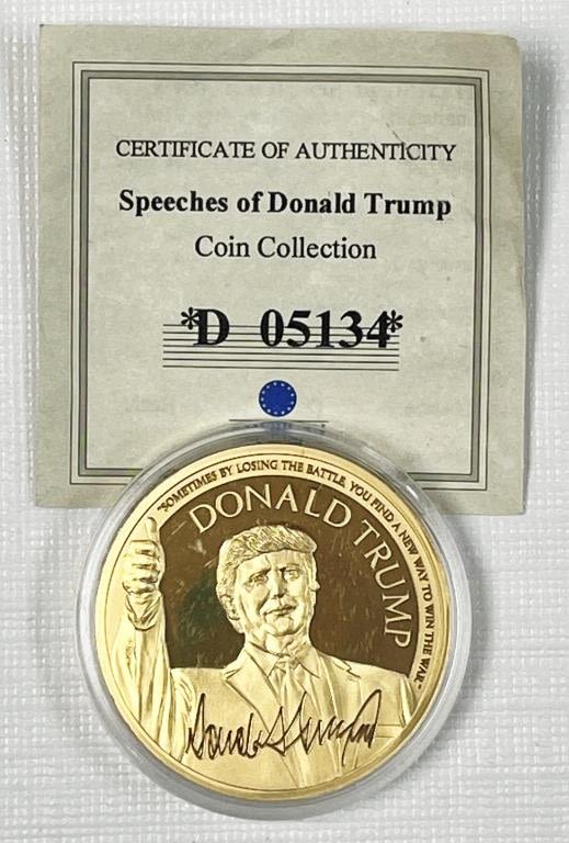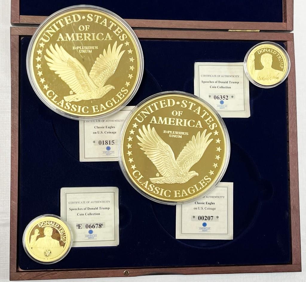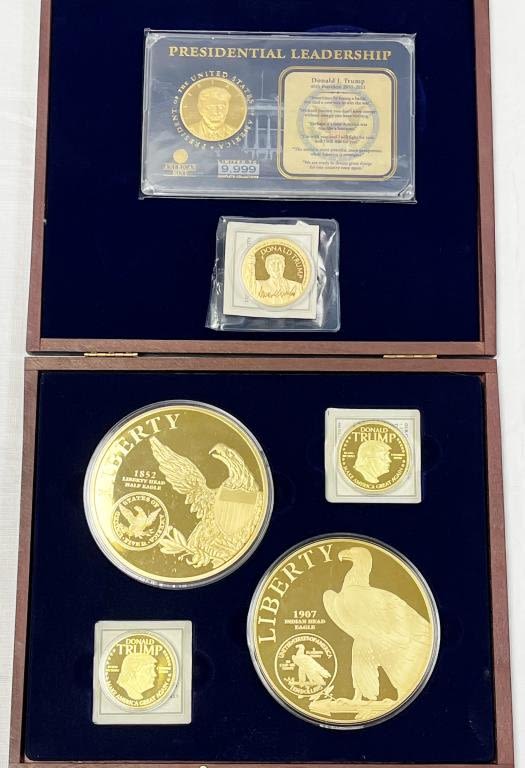 (4) GOLD TONED DONALD J TRUMP COMMEM COINS & (2) LARGE LIBERTY COMMEMS w/WOOD BOX
