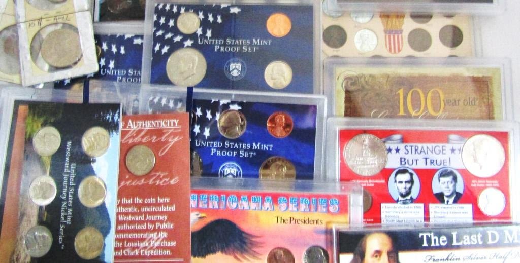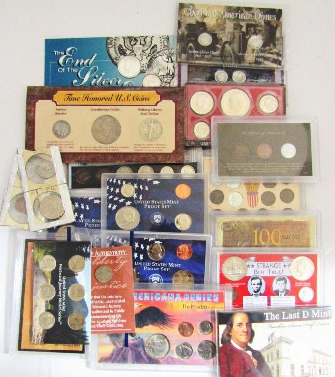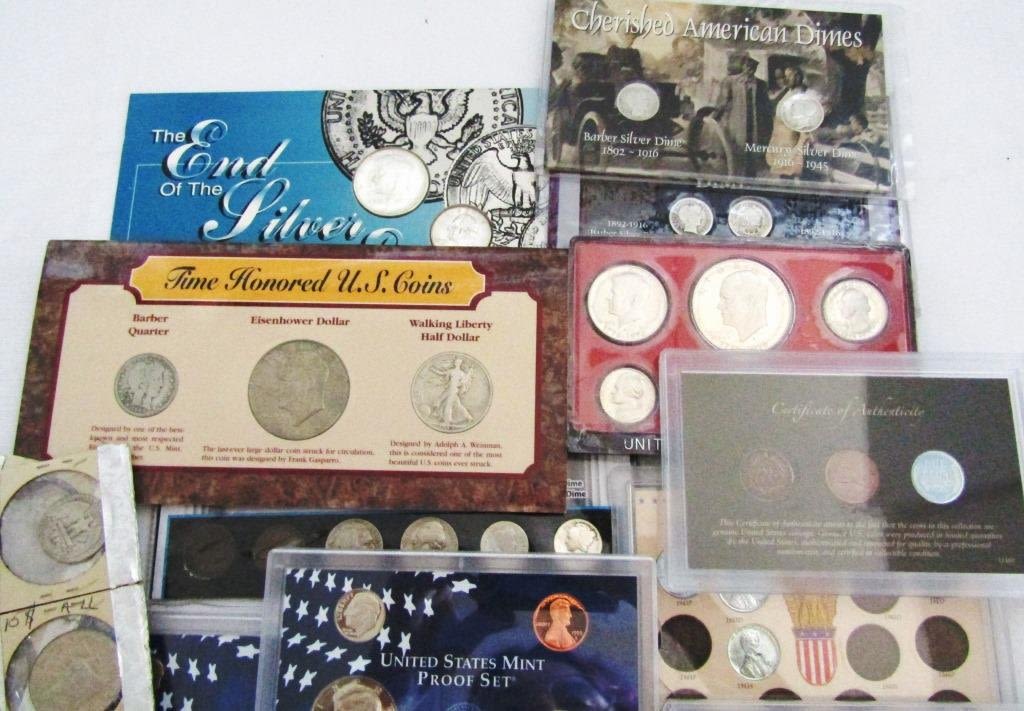 VARIOUS SETS; DOLLAR COINS, (4) SILVER HALF DOLLARS, (2) 40% SILVER HALF DOLLARS, (3) SILVER QUARTERS, (9) SILVER DIMES, BUFFALO NICKELS, INDIAN PENNIES, PROOF COINS & MORE – GREAT LOT!