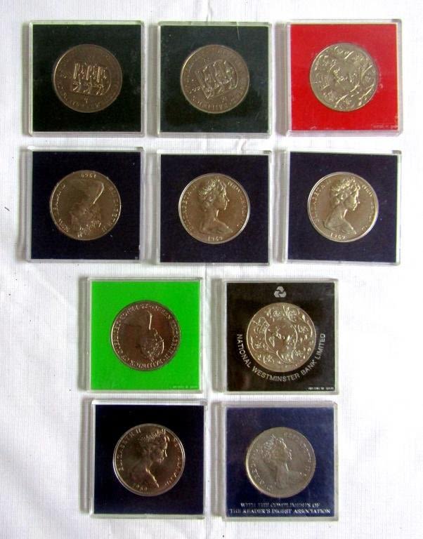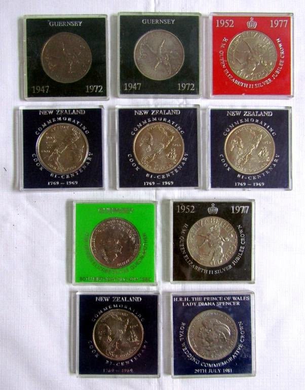 NEW ZEALAND UNC COINS – (2) 1972 GUERNSEY, (2) 1977 SILVER JUBILEE CROWN, (1) 1980 QUEEN MOTHER, 1981 PRINCE of WALES & LADY DIANA – in 2 1/2 x 2 1/2 ORIGINAL HOLDERS