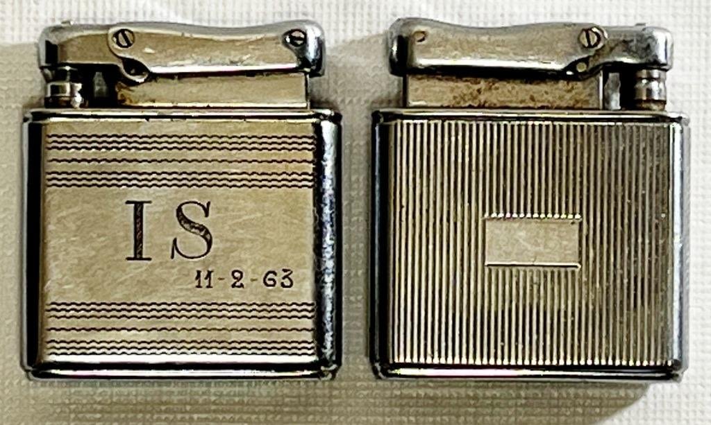 (1) Engraved with IS 11-2-63, (1) Plain silver tone marked No. 2571329 on bottom.