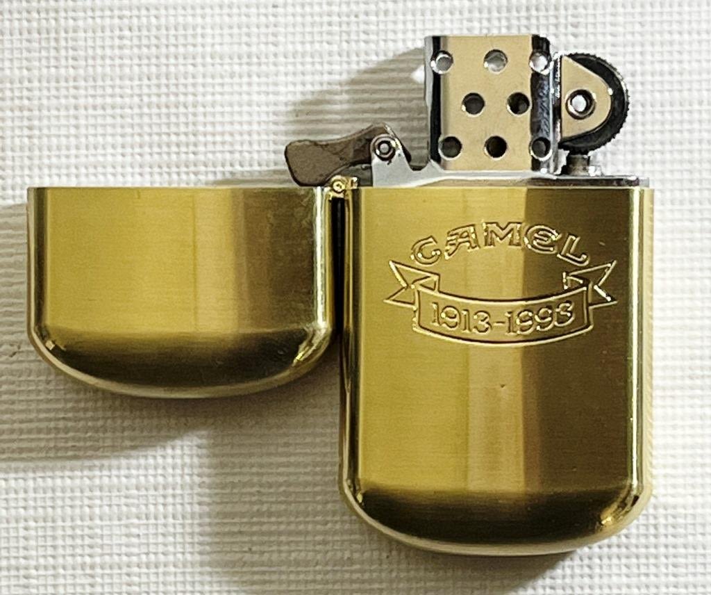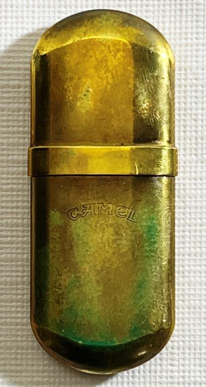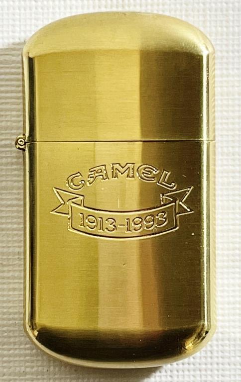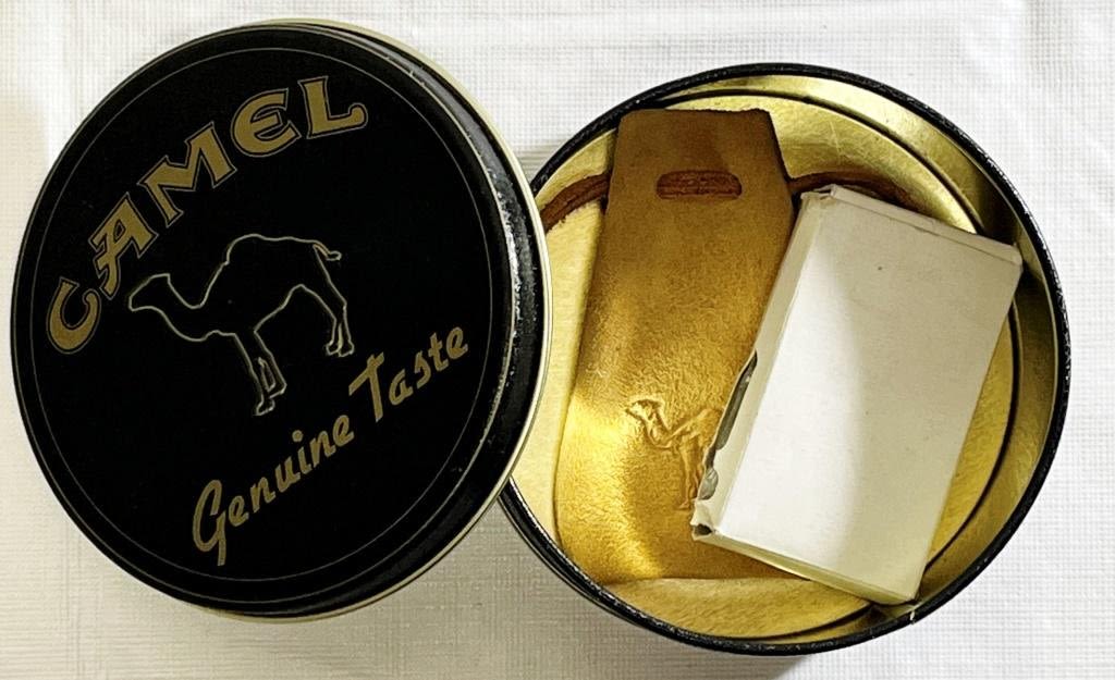 (1) Camel Brass No. 5 Lighter in tan leather Camel bag. (1) Camel Gold tone Lighter Engraved with Camel and 1913-1993 in box. Camel Collectors Tin Black Camel Genuine Taste tin.