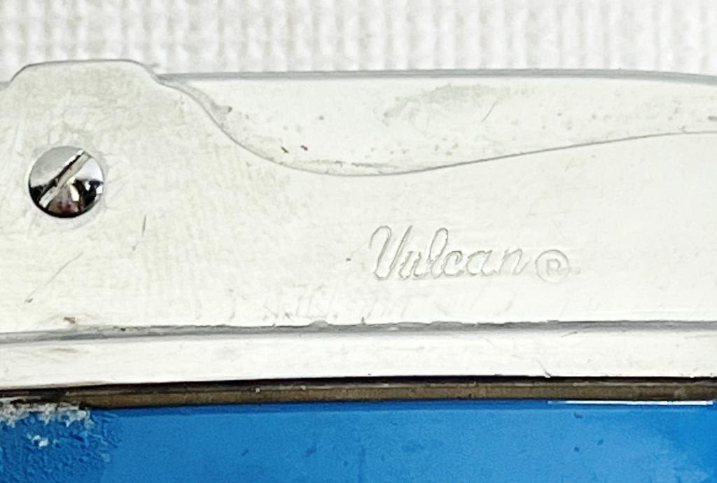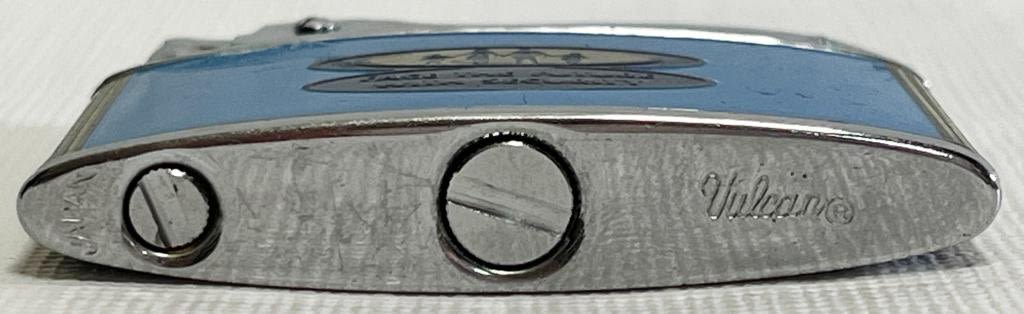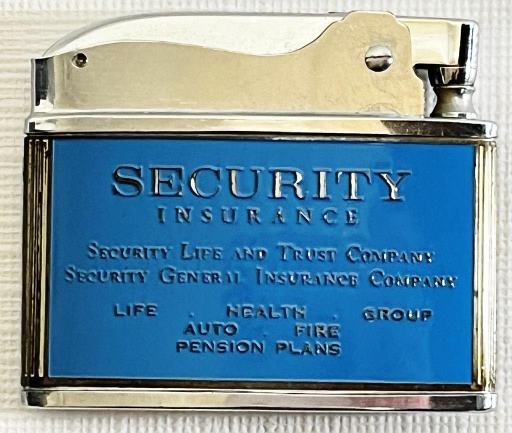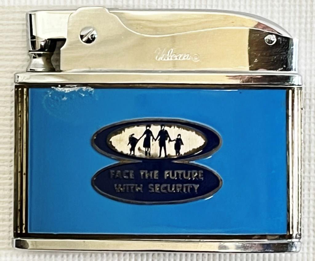 Vintage Vulcan lighter advertising security insurance, Face the future with security logo on one side, Marked Vulcan on top and bottom.