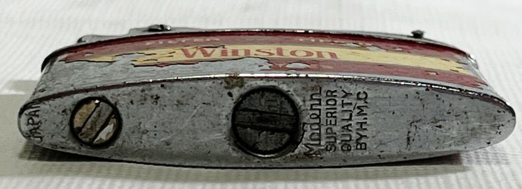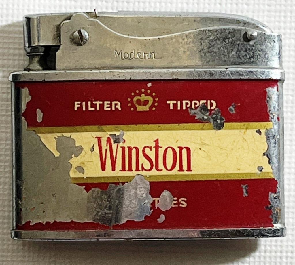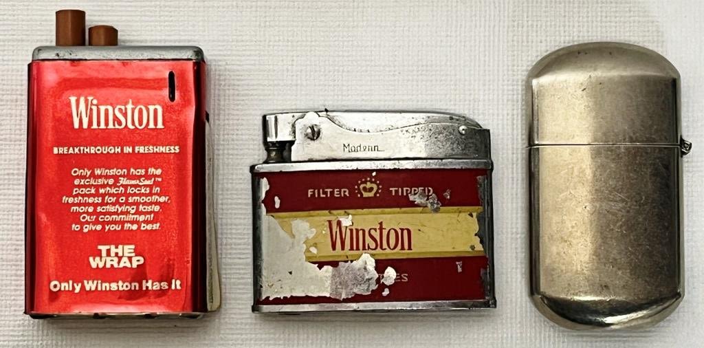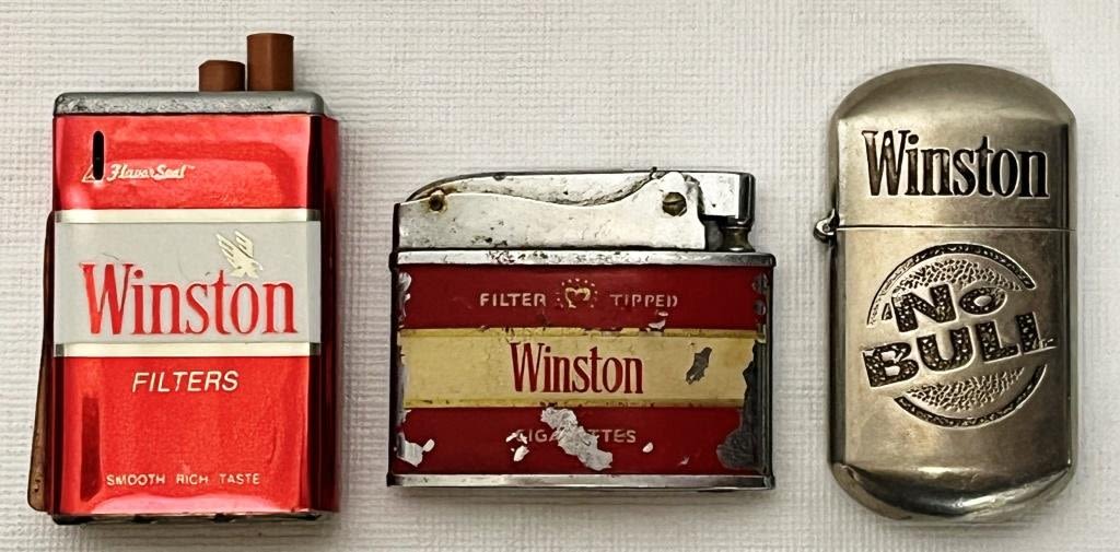 (1) Winston Modern Brand Muscle Arm Lighter, (1) Winston Packlight Brand Lighter Marked Korea, (1) Silver like Winston "No Bull" Lighter