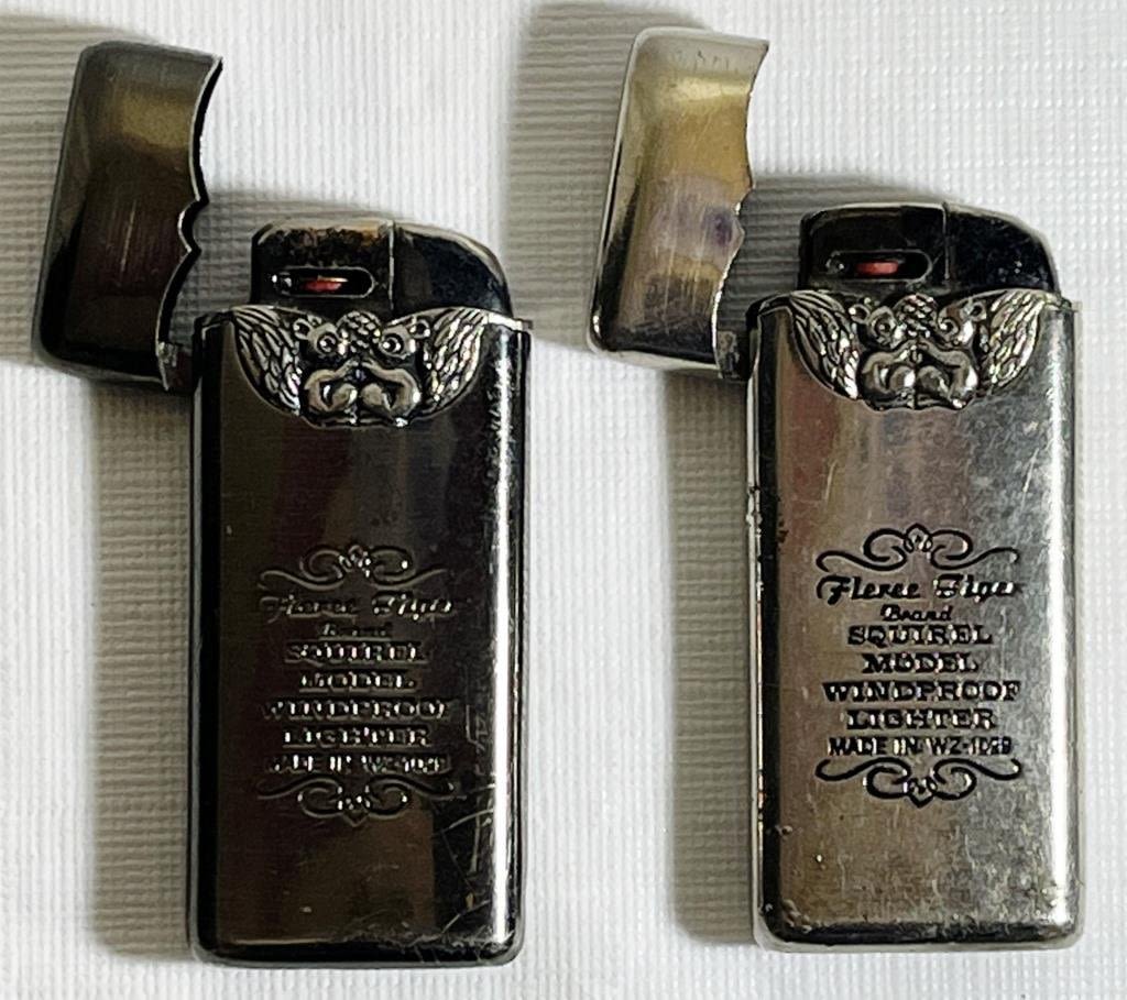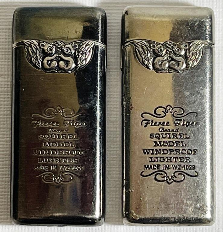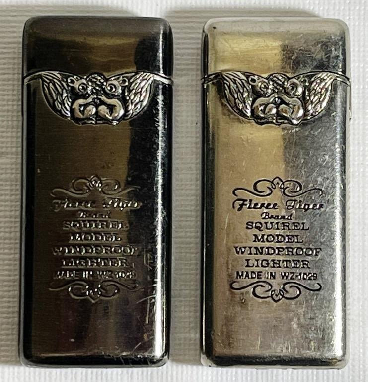 (2) Fierce Tiger Brand Lighters, Squirel Model, Windproof, Made in WZ-1029, Squirrels facing each other holding a nut near the lid on both sides.