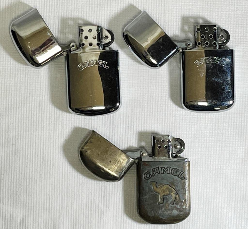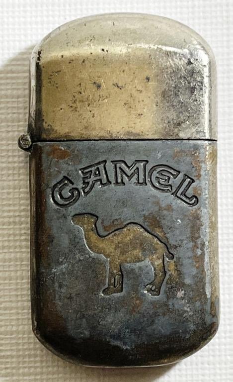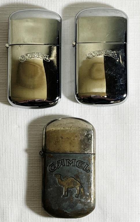 (2) Silver Tone Camel Advertising lighters, Marked Camel. Estimated year 1992., (1) Silver tone with wear Camel Lighter with Camel Logo and marked Camel, Bottom is marked China, Esitmated year 1997.