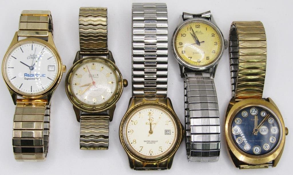 BANDS: ELIGIN WR CALENDAR-LOUIS 17 JEWELS ANITMAGNETIC-MIDO(RUNNING)TIMEX WR DAY DATE PLUS OTHER-ALL WATCHES UNTESTED/PARTS/REPAIR