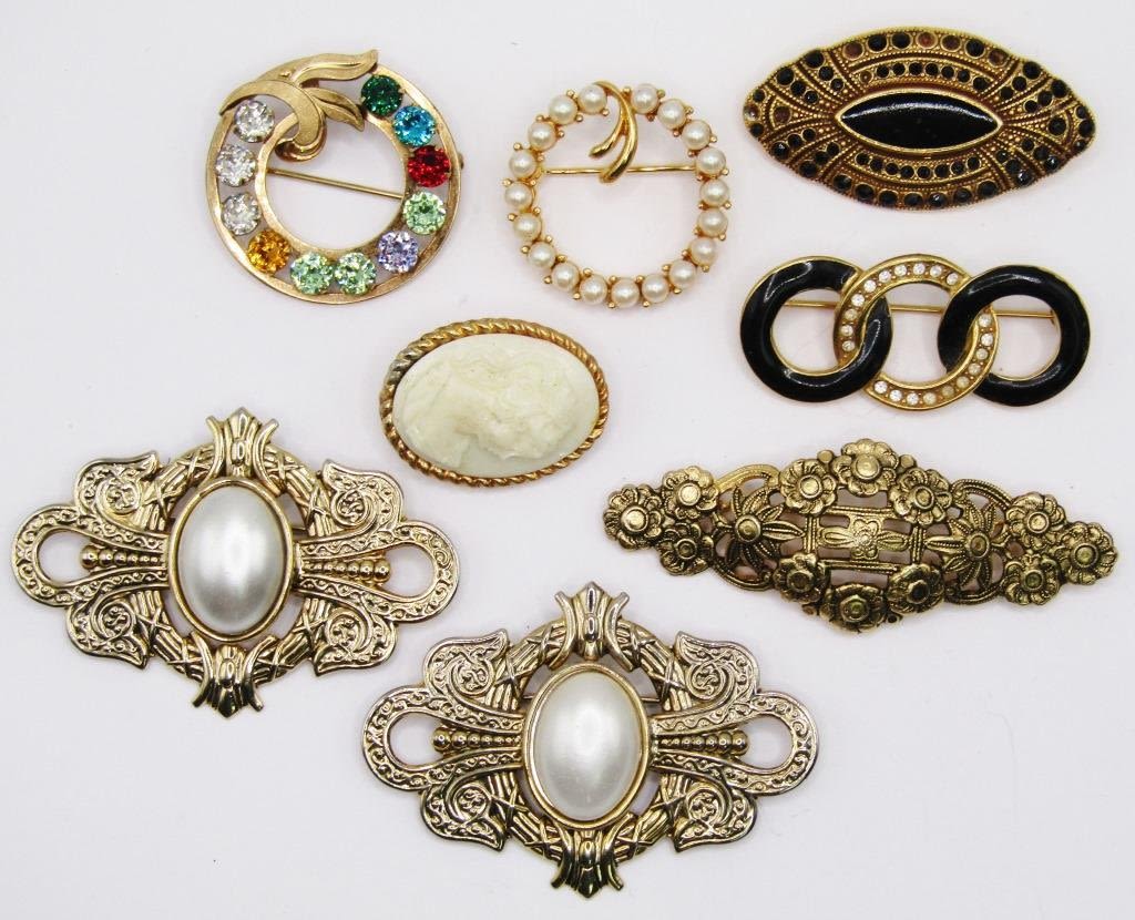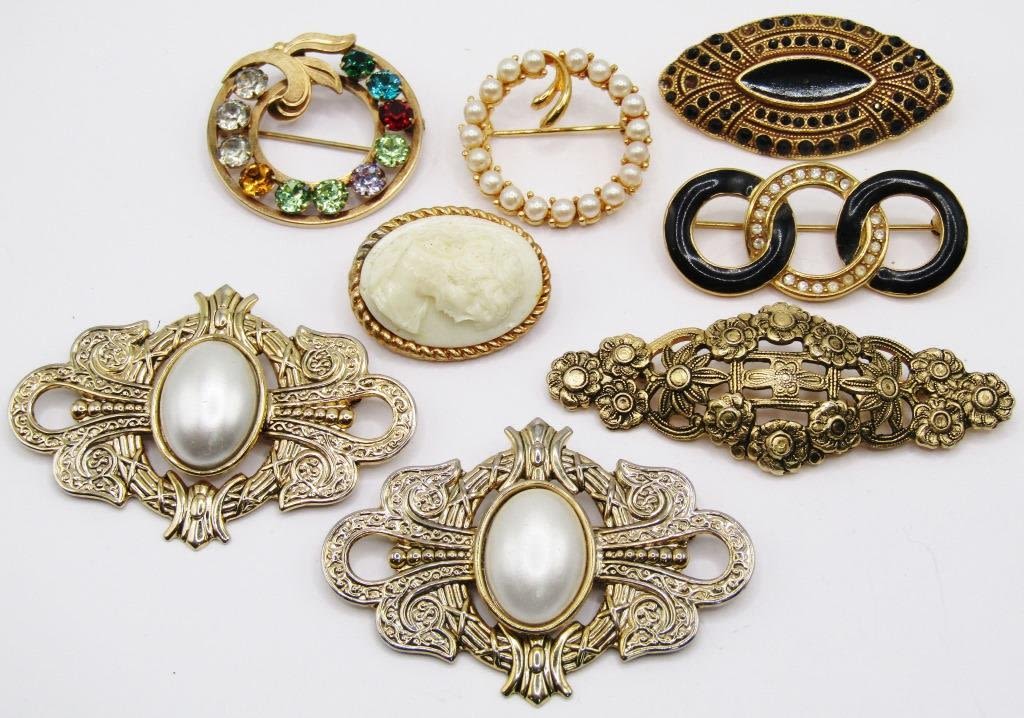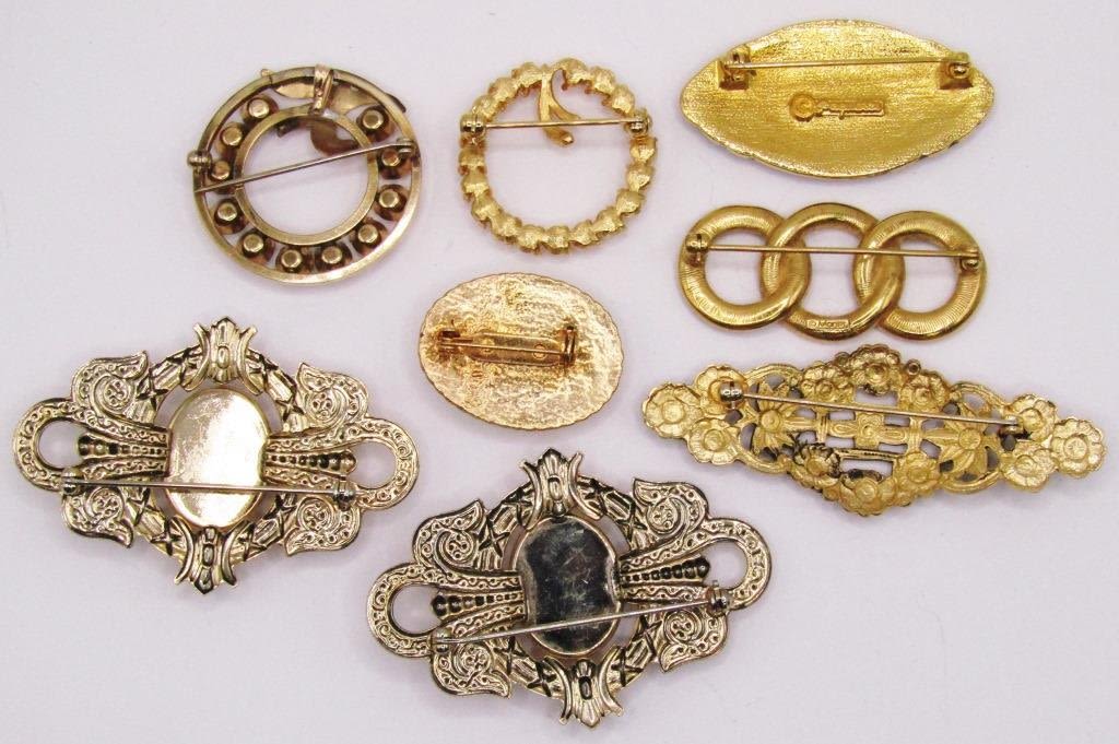 (8) GOLD TONED PINS, INCLUDING PAGUETTA PIN W/ BLACK GEMS