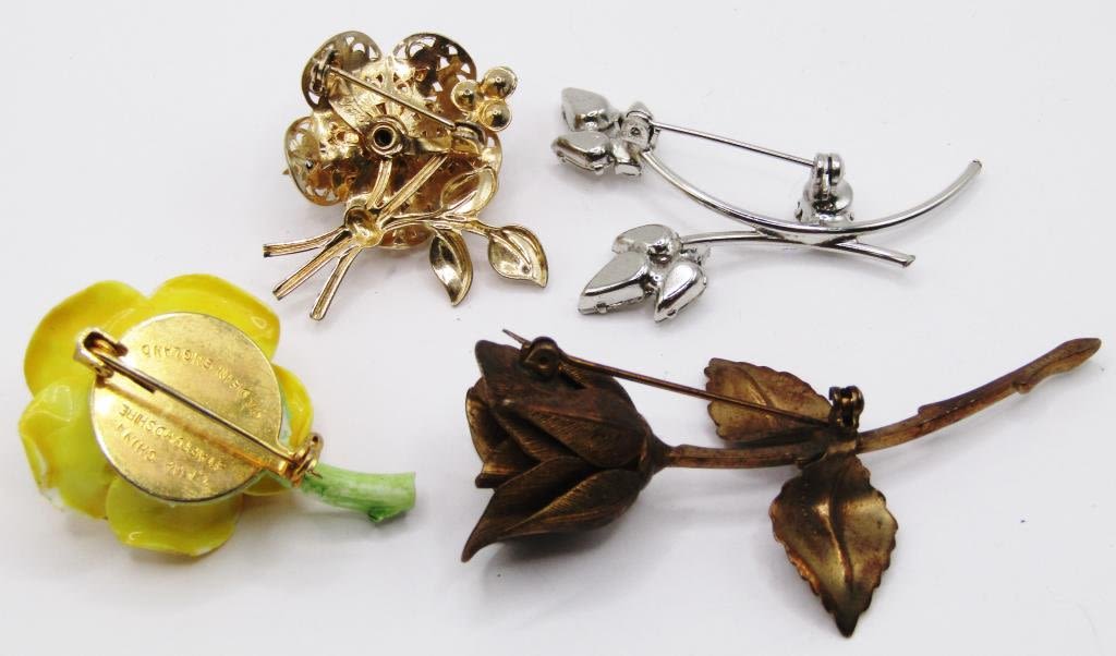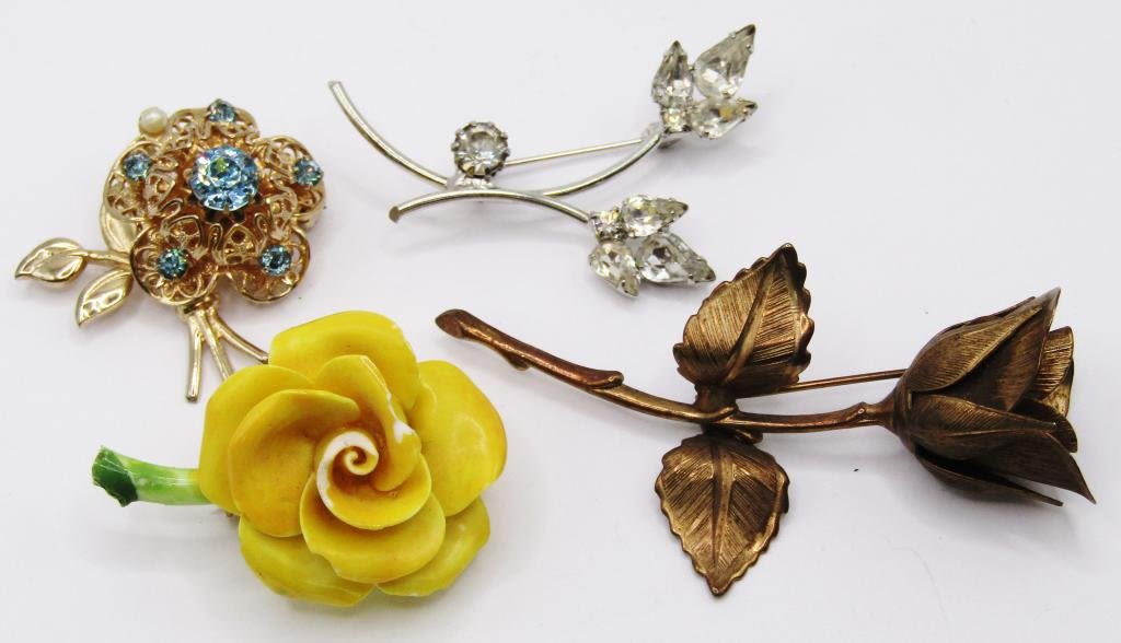 (4) BEAUTIFUL FLOWER BROOCHES 1-ACRYLIC, 2-W/ RHINESTONES
