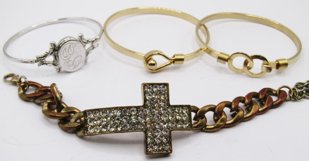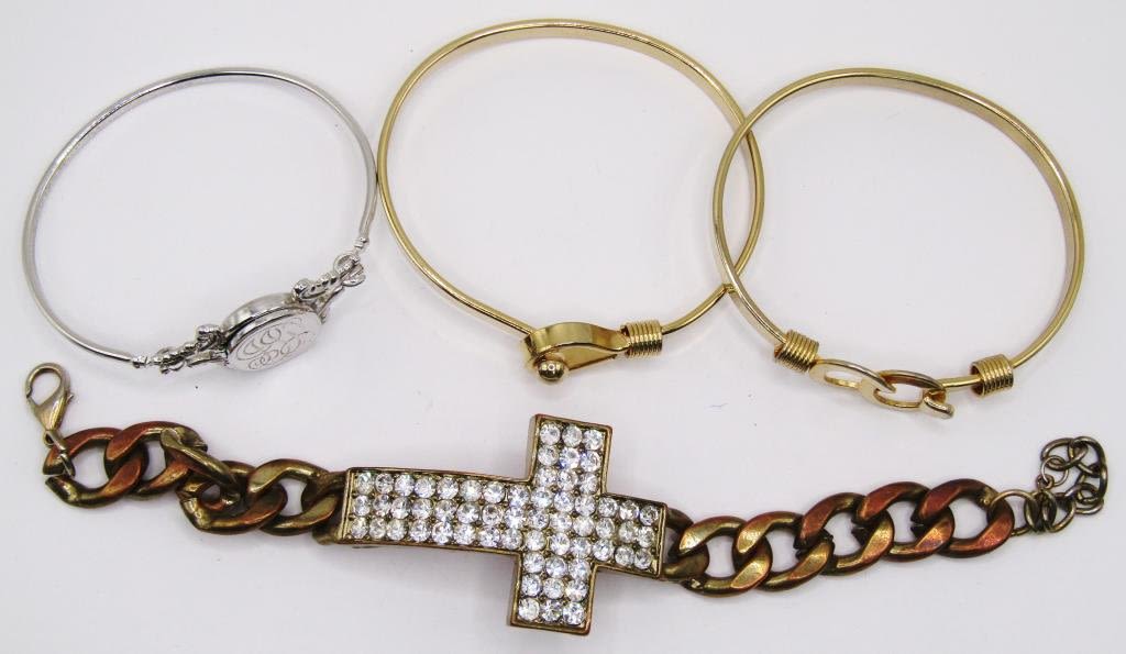 (2) GOLD TONED BANGLES (1) GOLD TONED CHAIN LINK BRACELET W/ RHINESTONE CROSS PENDANT, (1) SILVER TONED LOCKET BANGLE BRACELET