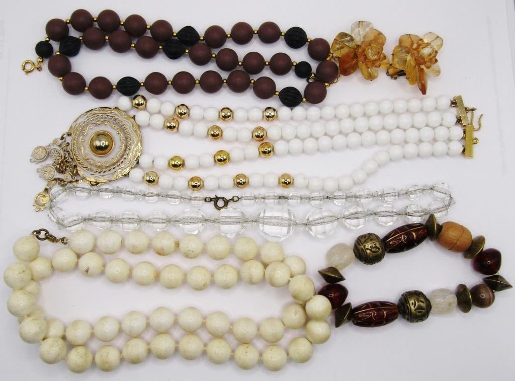 (4) MULTI COLORED BEADED NECKLACES (1) MULTI COLORED BRACELET (1) YELLO TONED BEADED CLIP ON EARRINGS