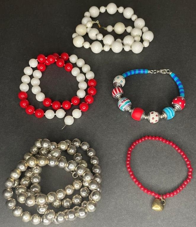 3 NECKLACES, ONE WHITE, ONE RED AND WHITE, ONE SILVER TONED, 2 BRACELETS, ONE RED WITH HEART , ONE BLUE WHITTE AND RED.