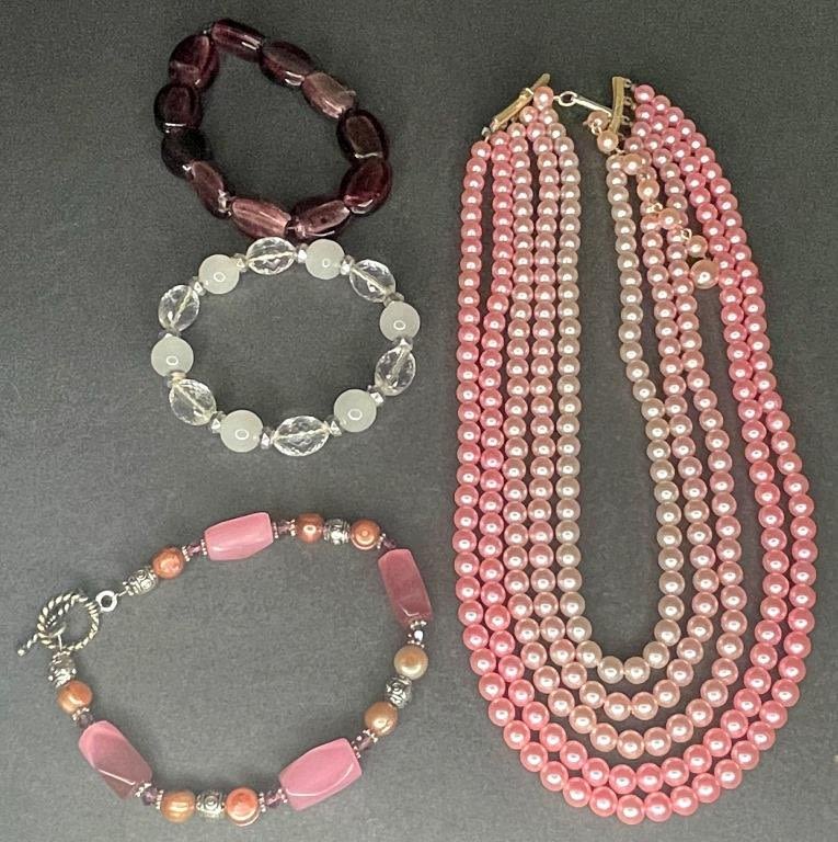 PINK NECKLACE, ONE PURPLE BRACELET, ONE PINK, ONE CLEAR