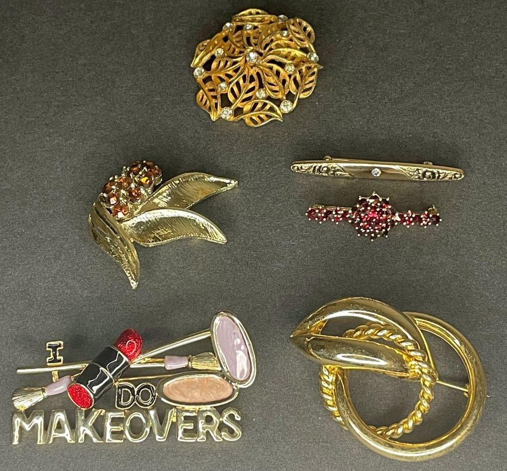 ONE MARKED AVON, ONE WITH RED GEMS, ONE WITH ORANGE GEMS, ONE " I DO MAKEOVERS"