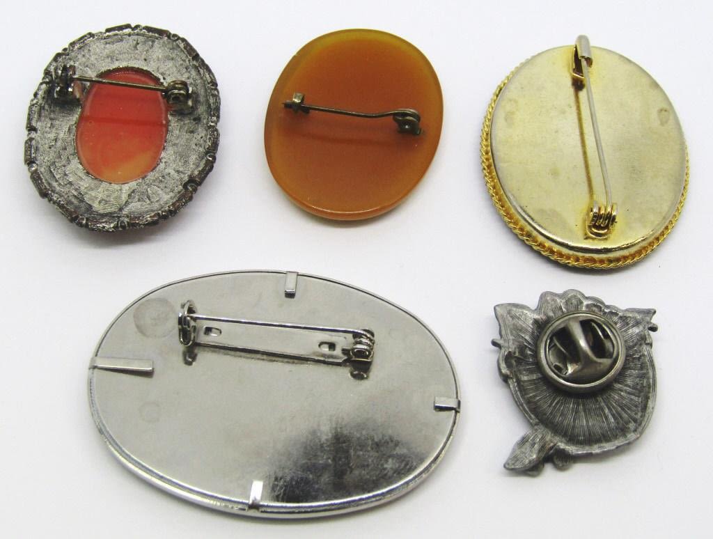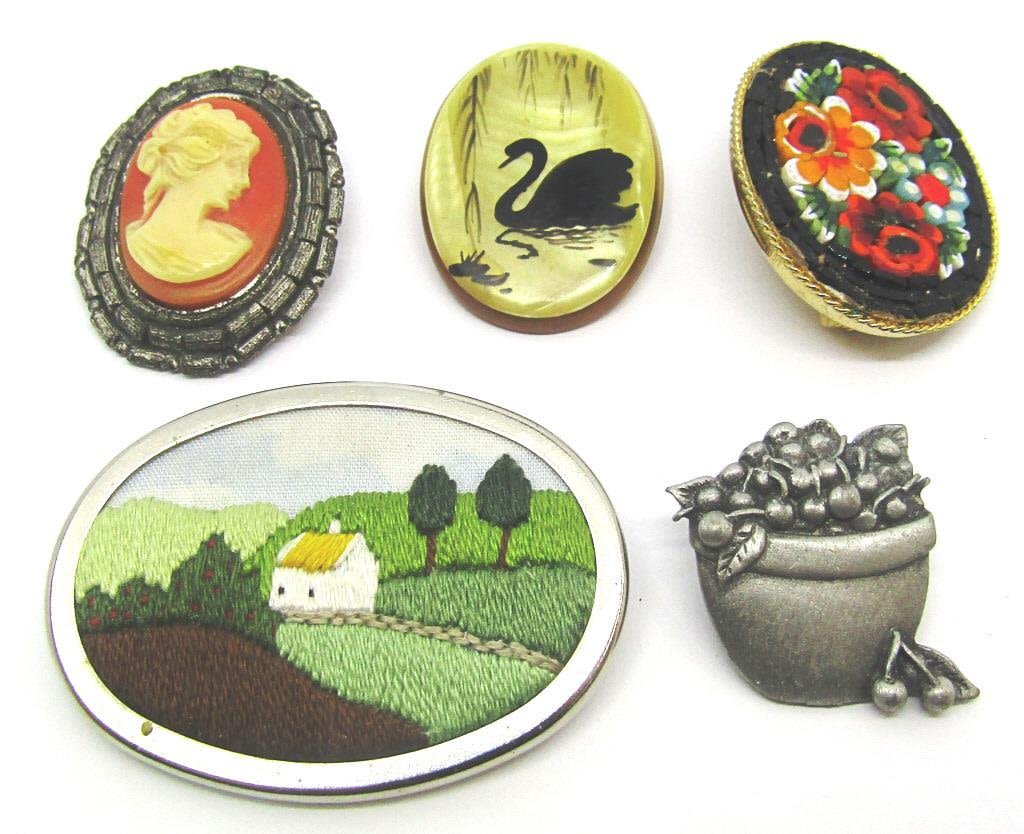 (1) MOSAIC FLORAL DESIGN BROOCH (1) CAMEO BROOCH (1) EMBROIDERED HOUSE BROOCH (1) CHERRY BUCKET BROOCH (1) PAINTED SWAN BROOCH