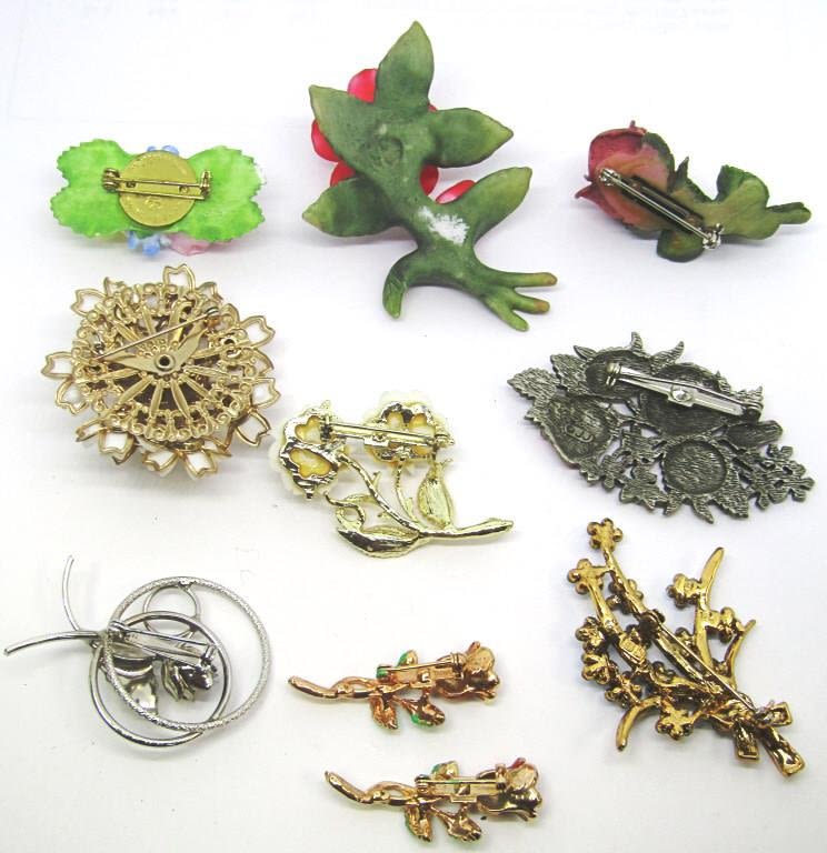 (2) MATCHING GOLD TONED ROSE BROOCHES W/ RED & GREEN PAINTED DETAIL (2) CLAY CARVED ROSE (1) GOLD TONED W/ WHITE ROSES (1) SILVER TONED W/ PAINTED FLOWERS (1) ENAMEL FLOWER (1) SILVER TONED ROSE W/ LEAF (1) GOLD TONE
