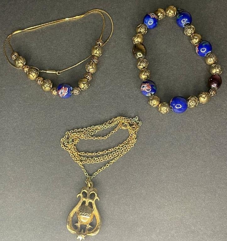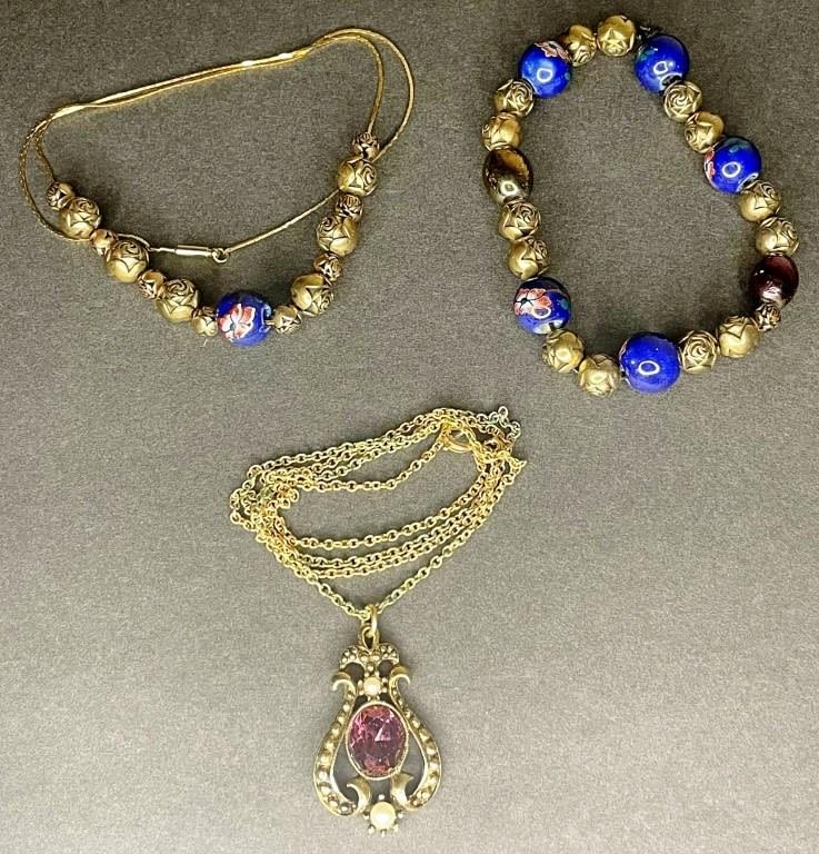 ONE WITH BLUE FLOWER BEAD, ONE MARKED AVON WITH PURPLE AND PEARL LIKE BEADS