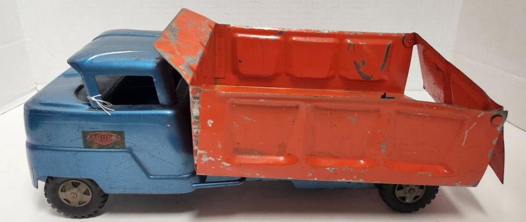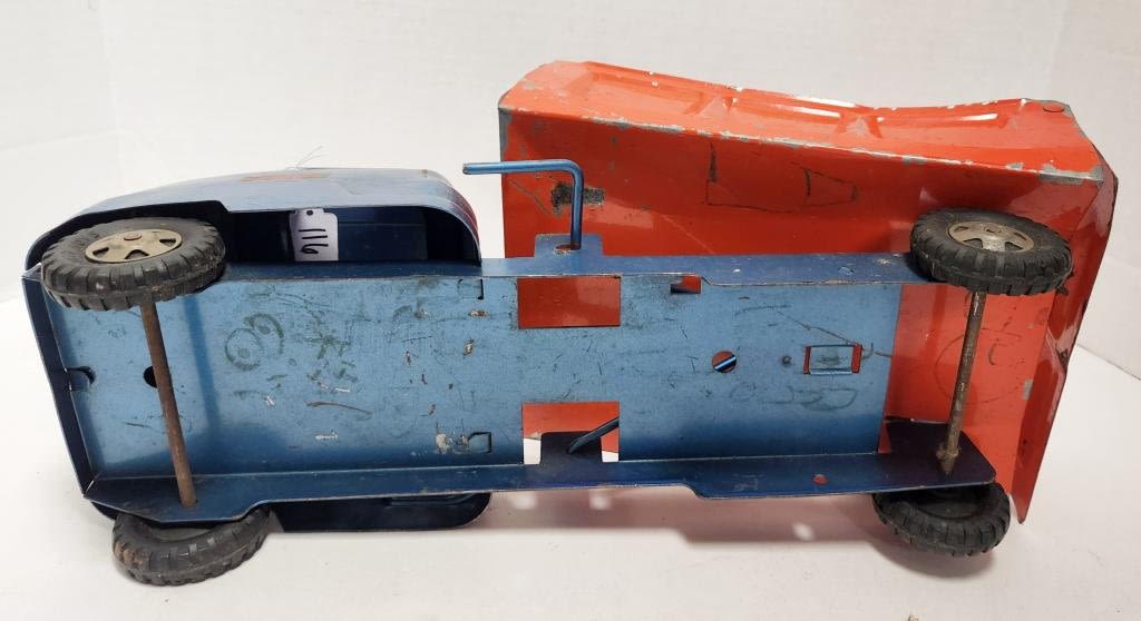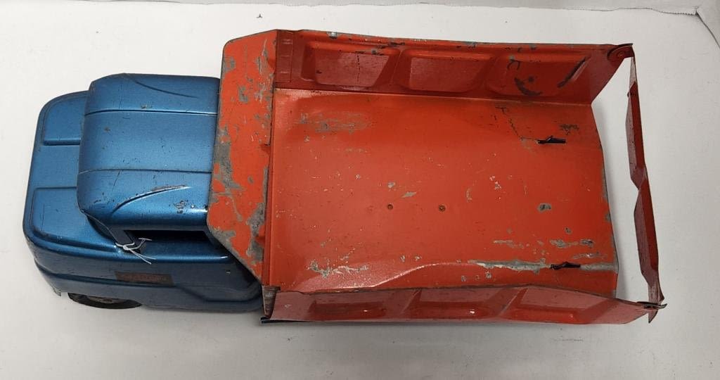 Structo Dump Truck, Frame is in good shape, Doesn’t have grill or lights, Bed of the truck is dented, Bed of truck lifts up, Wheels are in good shape, Could be used for Parts or Repair.