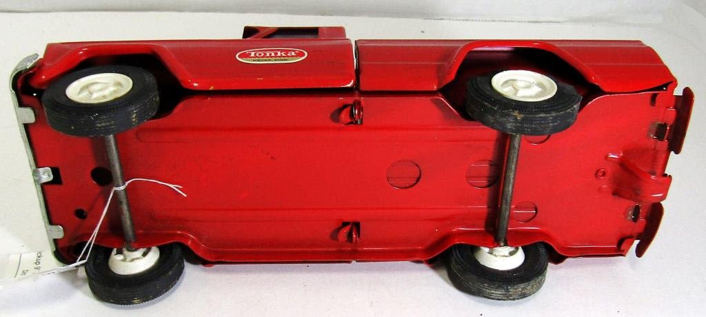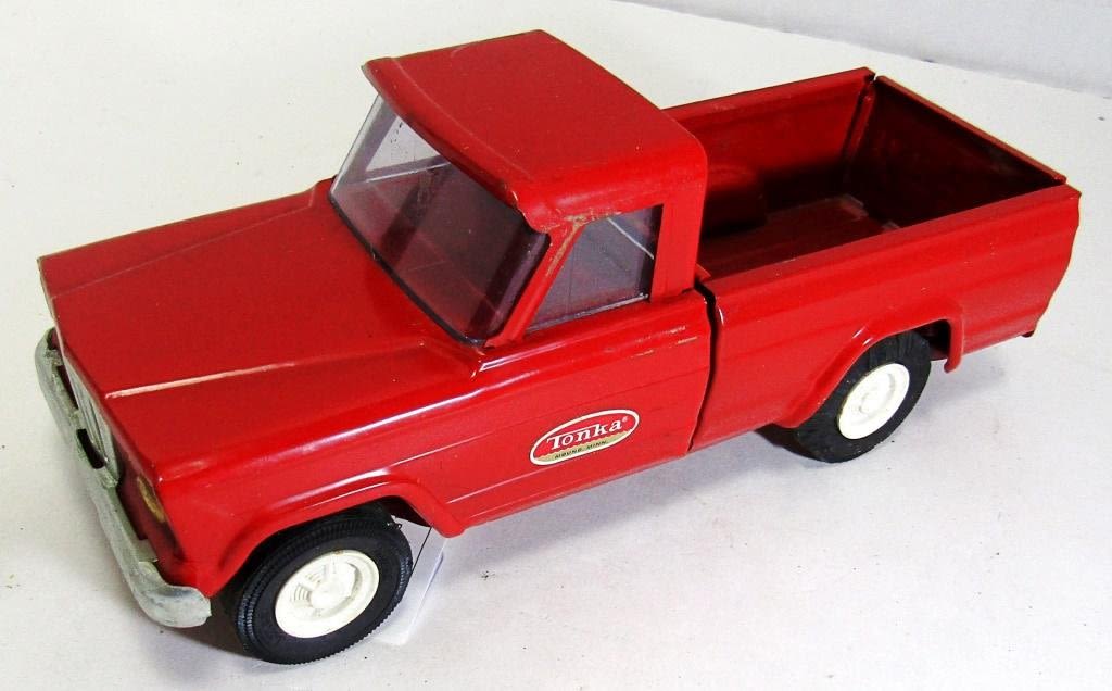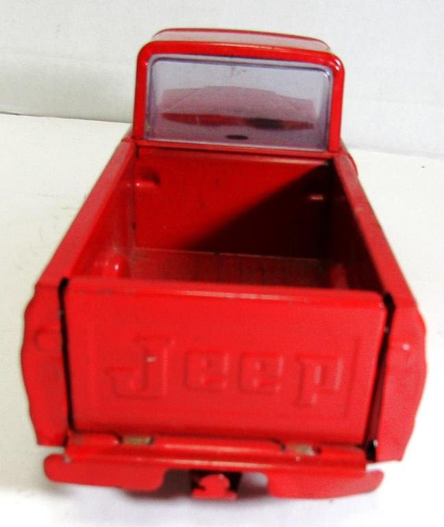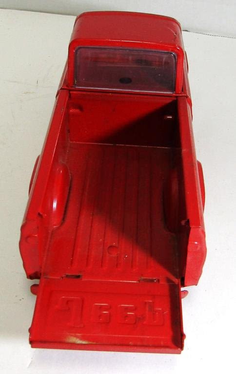 Red 1960’s Tonka Jeep Pickup Truck, 9 inches, has all windows, Body is in really good condition, One wheel is damaged, Tailgate opens and closes properly