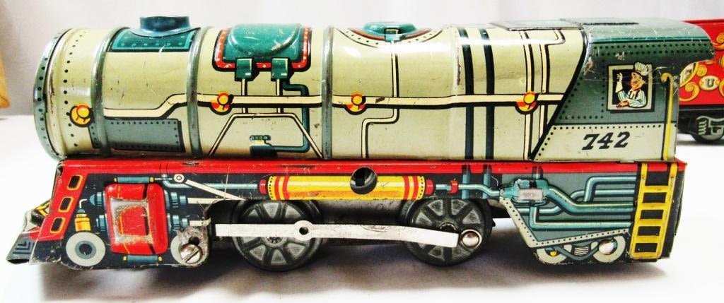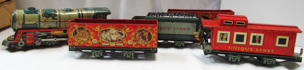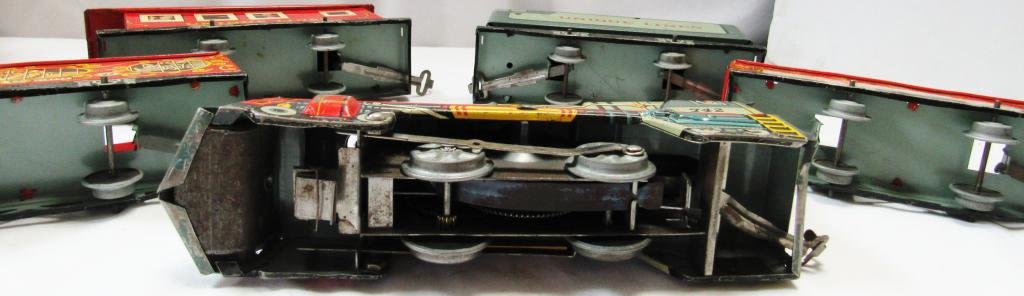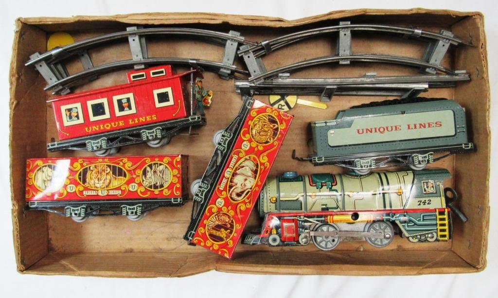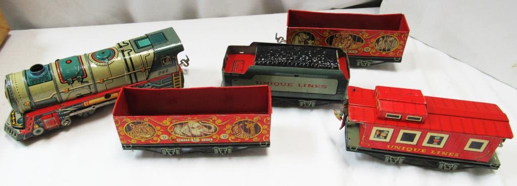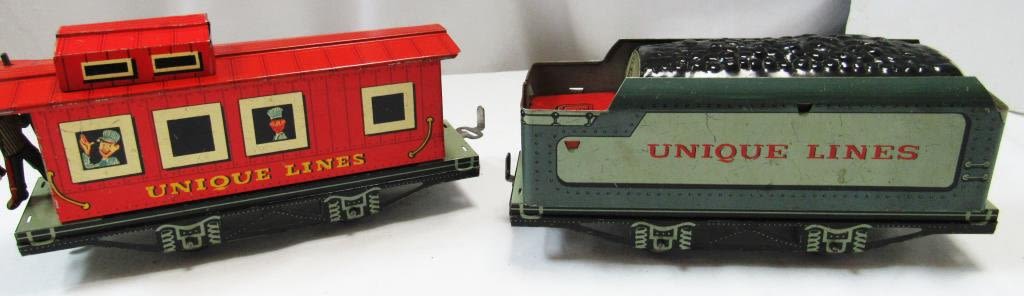 UNIQUE LINES Tinplate Litho-WIND UP Mechanical Train Set- Original Box includes ENGINE w/KEY , (3) CARS, (1) CABOOSE with TRACKS – WORKING CONDITION!