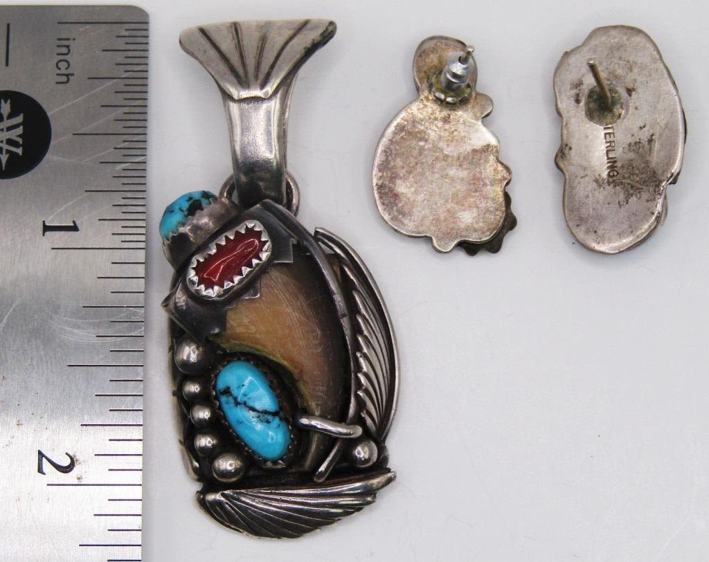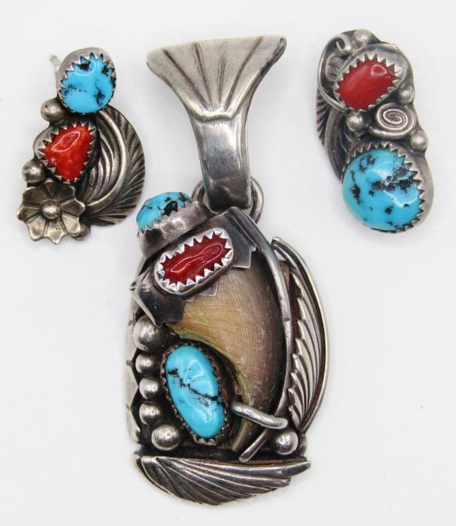 WITH RED CORAL/TURQUOISE/AND CLAW-COME WITH MATCHING PAIR OF PIERCED EARRINGS-TOTAL 21 DWT