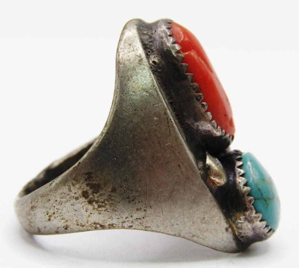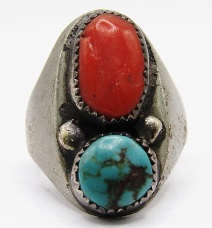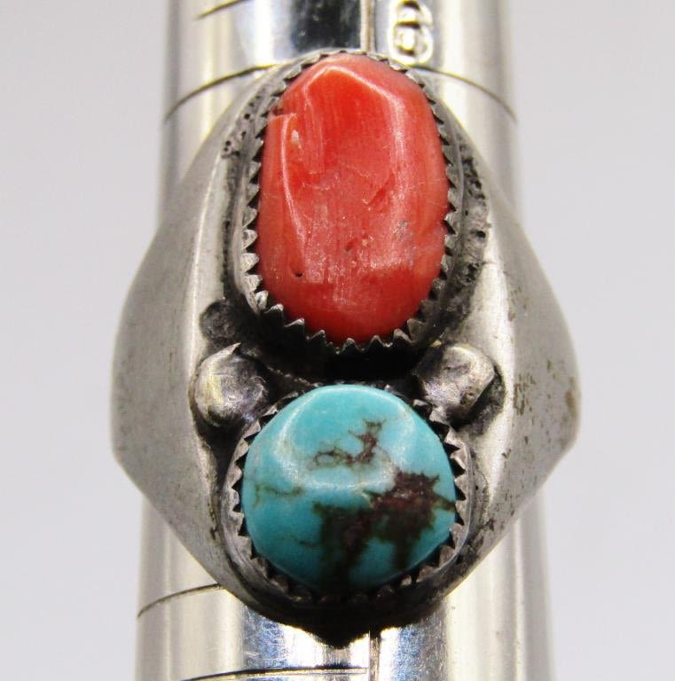 CORAL AND TURQUOISE STONES-RING SIZE 7.5-TOTAL 6 DWT