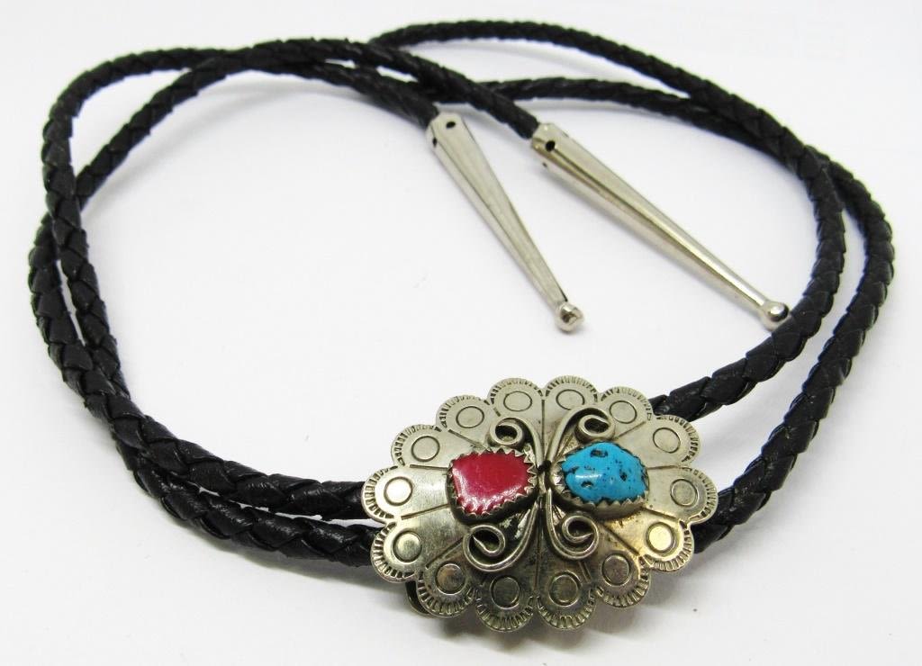 RED CORAL AND TURQUOISE STONES-COMES WITH LEATHER BOLO TIE-TOTAL 15 DWT