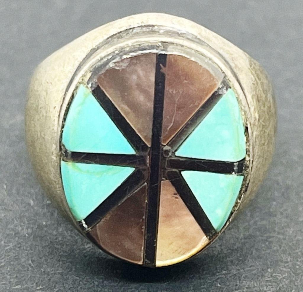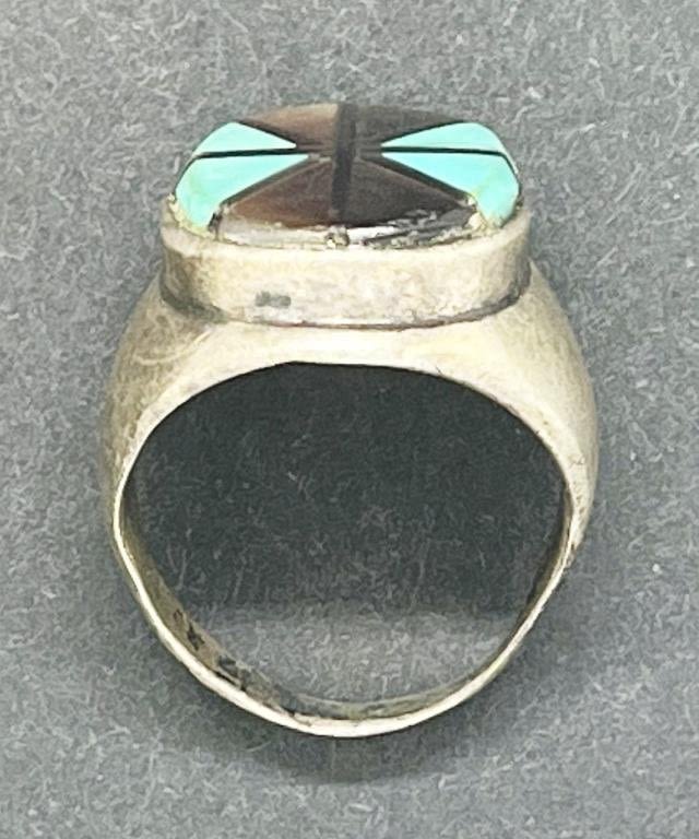 TURQUOISE/BLACK ONYX/ABILONE INLAY DESIGN-RING SIZE 8.5-TOTAL 9 DWT