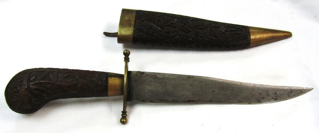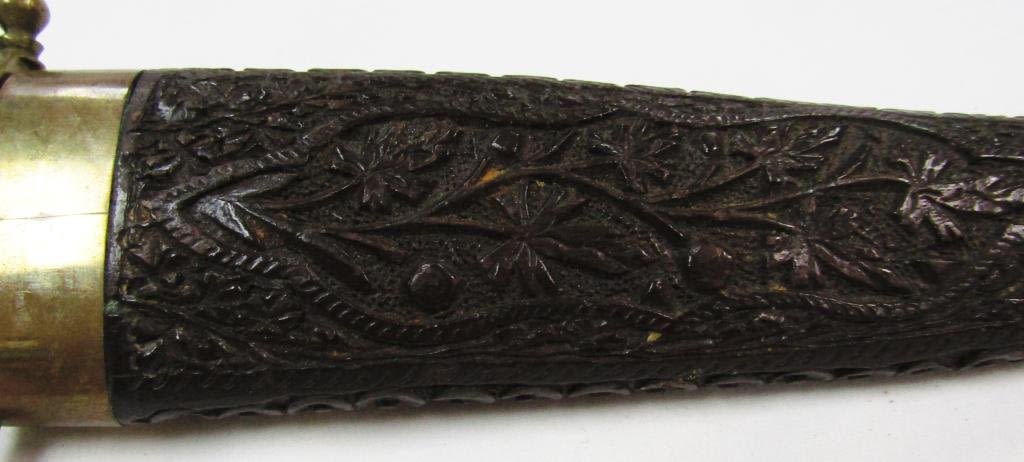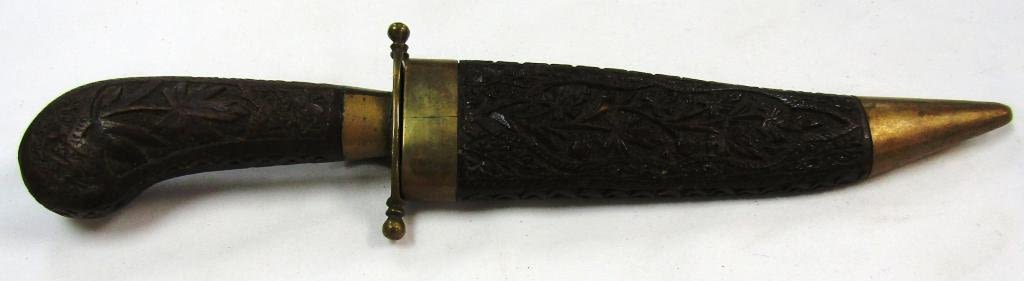 INTRICATELY CARVED WOODEN SHEATH/HANDLE; DAGGER LOCKS INTO THE SHEATH;