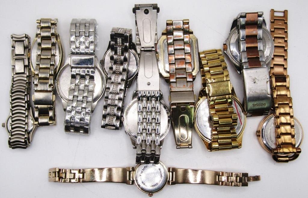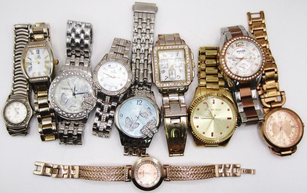 UNTESTED. Fossil, Geneva, Bulova, Valletta, Prestige by Waltham, Michael Koors, Invicta. Multiple color tones such as silver, gold, and rose gold. All watches have some bling.