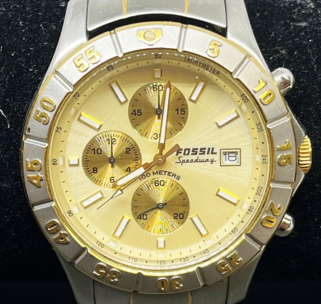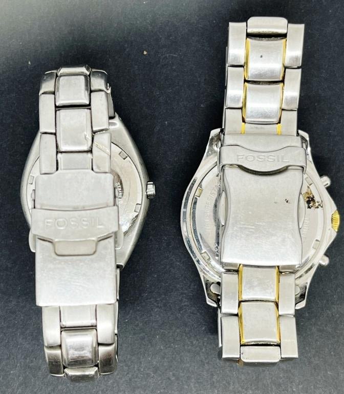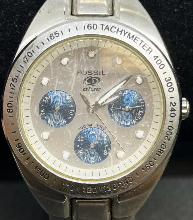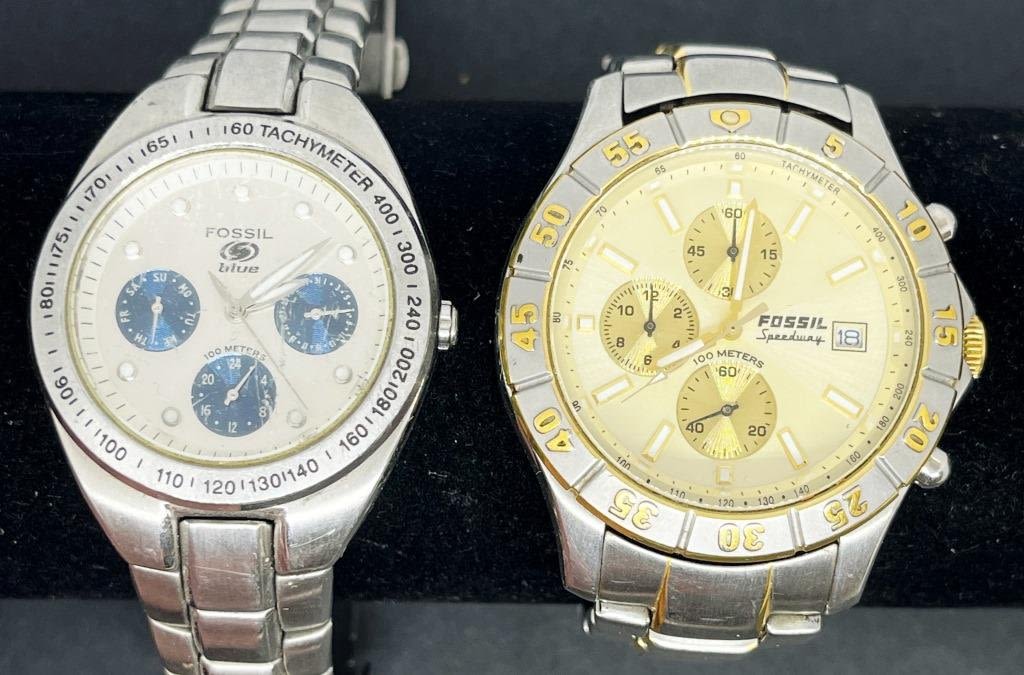 UNTESTED. Fossil Blue, Fossil Speedway. Both silver tone. 1 watch with blue subdials, 1 with gold tone subdials.