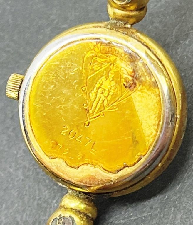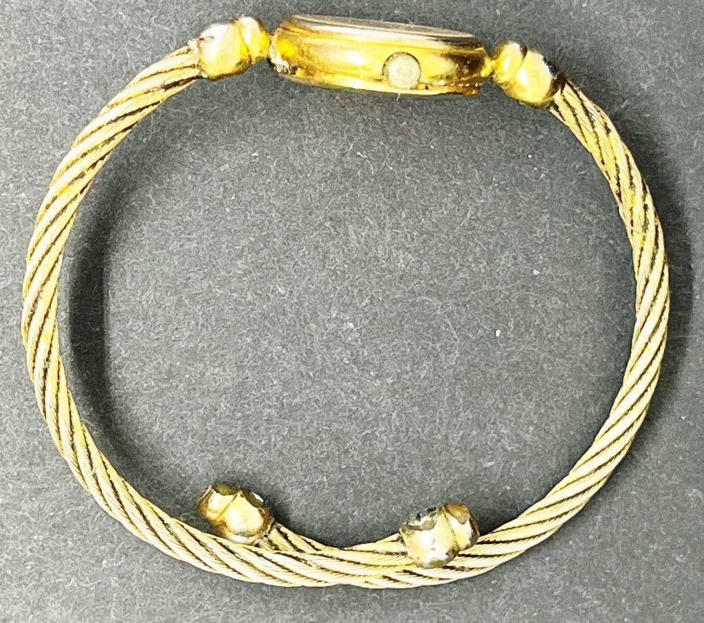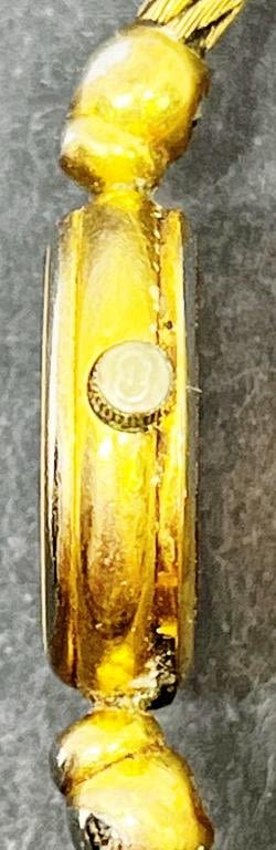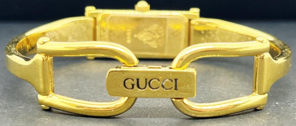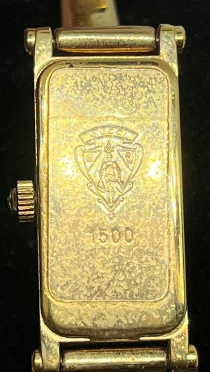 UNTESTED. GUCCI. Gucci gold tone bangle marked 2047L. Gold Tone Gucci Bracelet Style band, Mother of pearl dial face, marked 1500.
