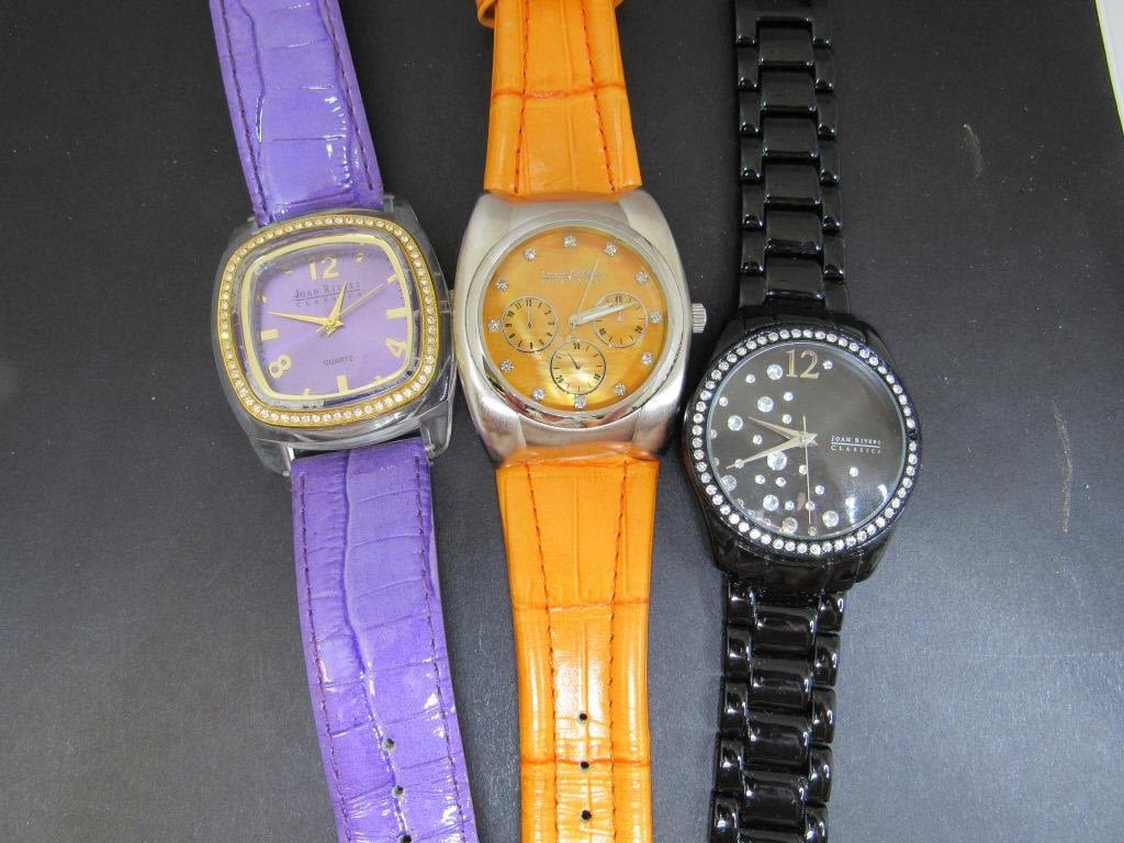 Not tested as to working or not-some for parts or repair-some may work-Joan River Classic Womens Quartz Wrist Watches (1)orange leather band (1) purple leather band (1) JR classic black steel link band-black dial