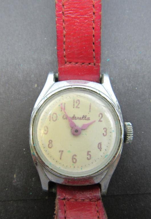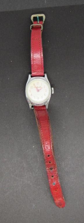 MECHANICAL WINDUP WITH RED LEATHER BAND-UNTESTED UNSURE IF WORKING