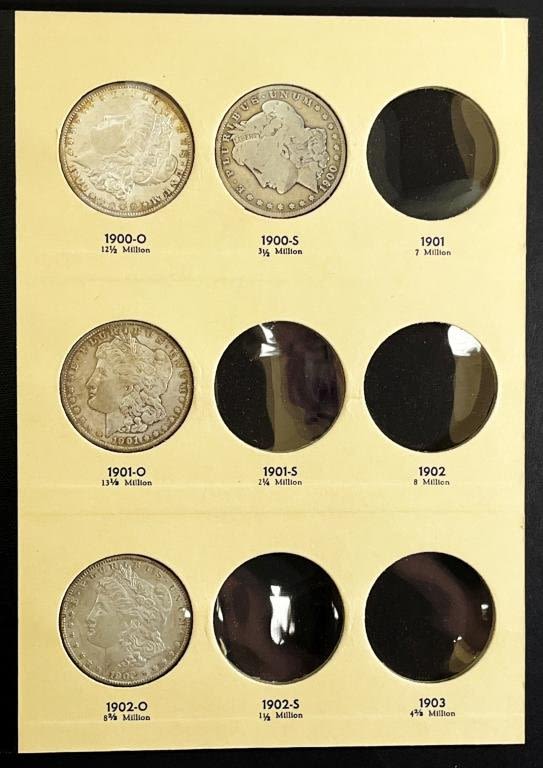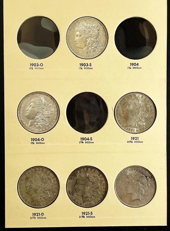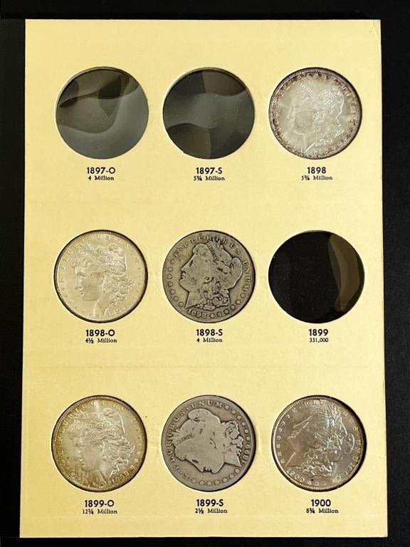 (15) MORGAN SILVER DOLLARS & 1 PEACE DOLLAR – 1898 BU, 1898-O BU, 1898-S CIRC, 1899-O UNC, 1899-S CIRC, 1900 BU, 1900-O BU, 1900-S CIRC, 1901-O UNC, 1902-O UNC, 1903-S XF, 1904-O BU, 1921 UNC, 1921-D & 1921-S CIRC,