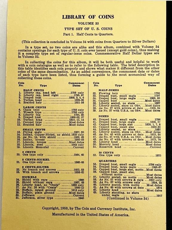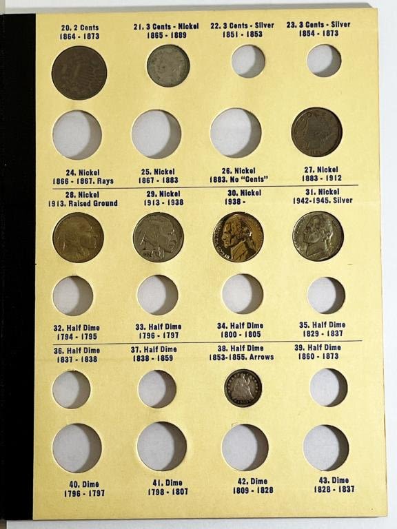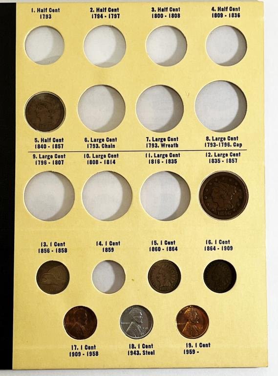 (19) U.S. COINS in ALBUM: HALF CENT, LARGE CENT, FLYING EAGLE CENT, (2) INDIAN CENTS, (3) LINCOLN CENTS, TWO CENT PIECE, THREE CENT NICKEL, "V" NICKEL, (2) BUFFALO NICKELS, JEFFERSON NICKEL, WAR NICKEL, SEATED HALF