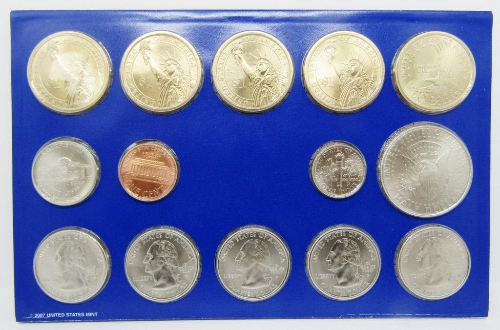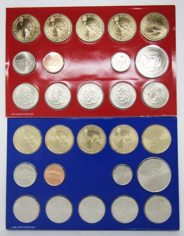 Each contain 5 dollar coins, 5 quarters, 1 each of halves, dimes, nickels, pennies.