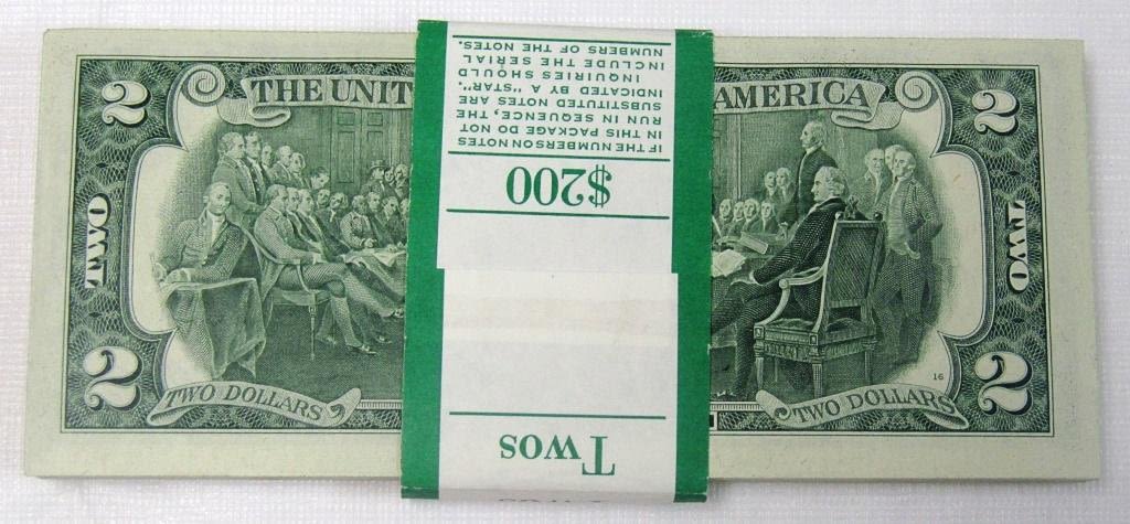 $198 FACE VALUE of CONSECUTIVE CU $2 BICENTENNIAL NOTES (missing serial #1999 ending) – ALL CU