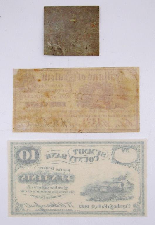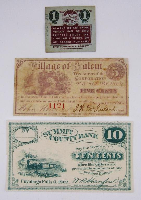 1862 VILLAGE of SALEM FIVE CENT, 1862 SUMMIT COUNTY BANK TEN CENTS, OHIO CONSUMER RECEIPT ONE CENT TAX STAMP / TICKET