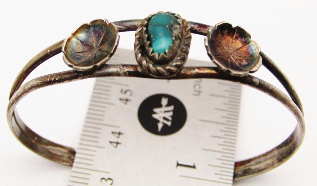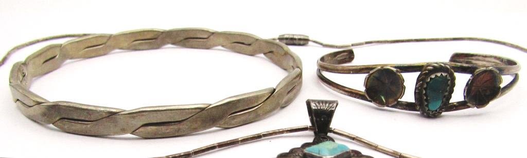 MARKED BANGLE (1)SOUTHWESTERN CUFF WITH TURQUOISE CENTER STONE & (1)LIQUID STERLING NECKLACE WITH PENDANT WITH LEAF TASSLES-TLTAL 19 DWT