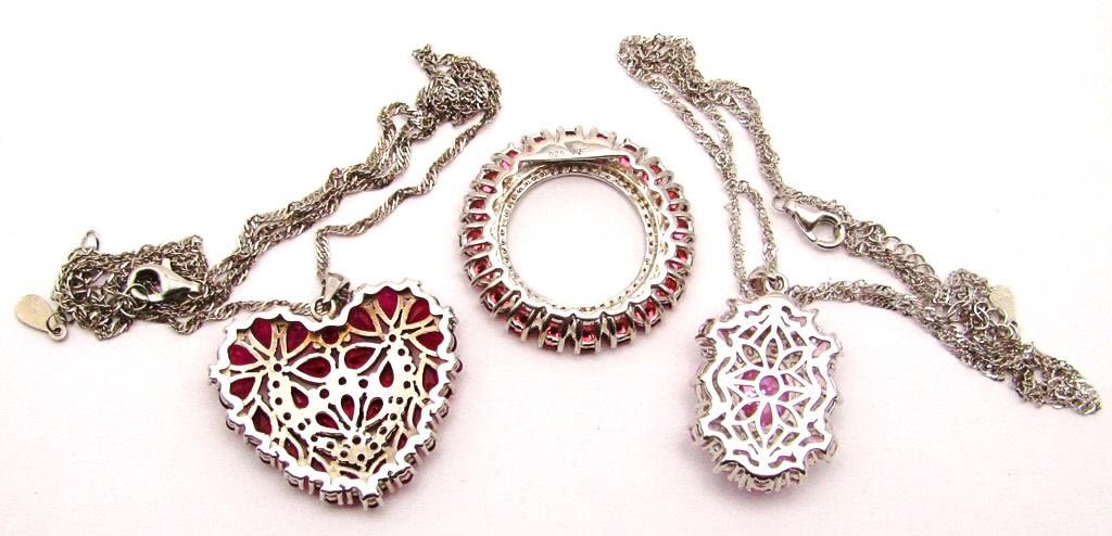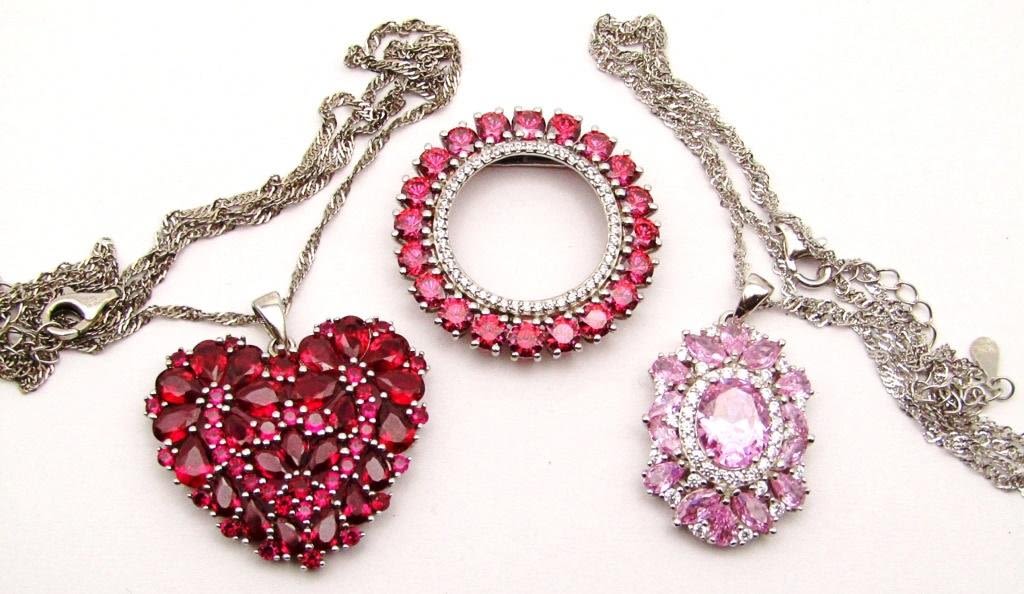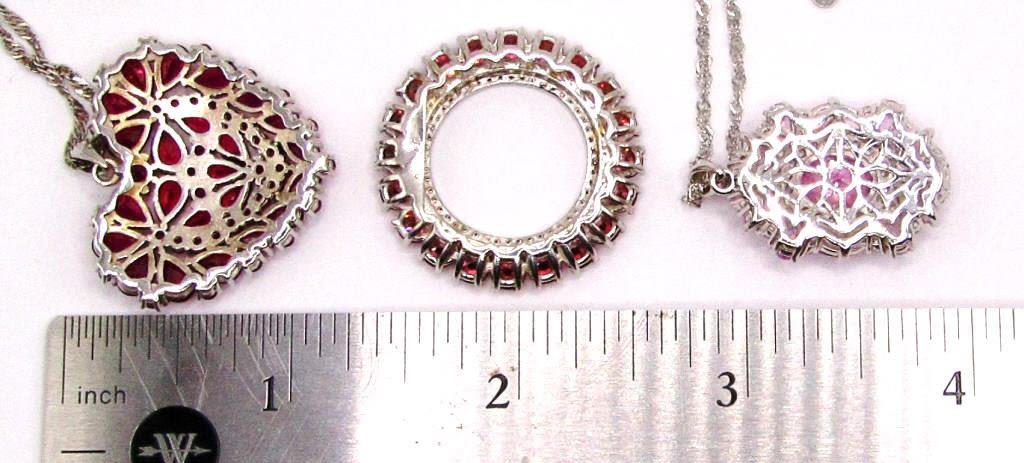 (1)BBJ MARKED HEART LOADED WITH GARNET STONES (1)BBJ MARKD WITH LIGHT PINK STONES (1)JF MARKED CIRCULAR WITH MAGENTA STONES-PENDANTS ALL LOOK NEW! TOTAL 15 DWT